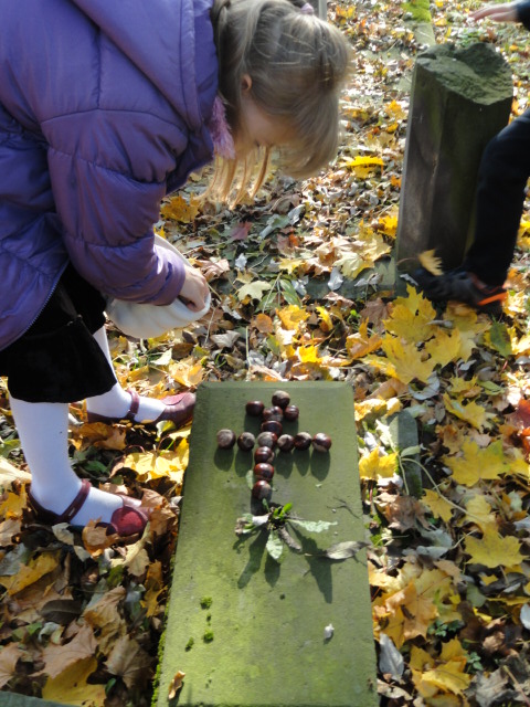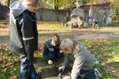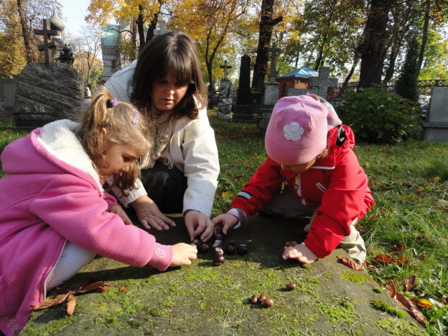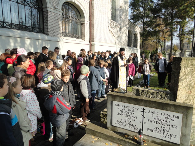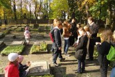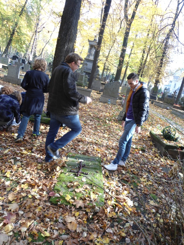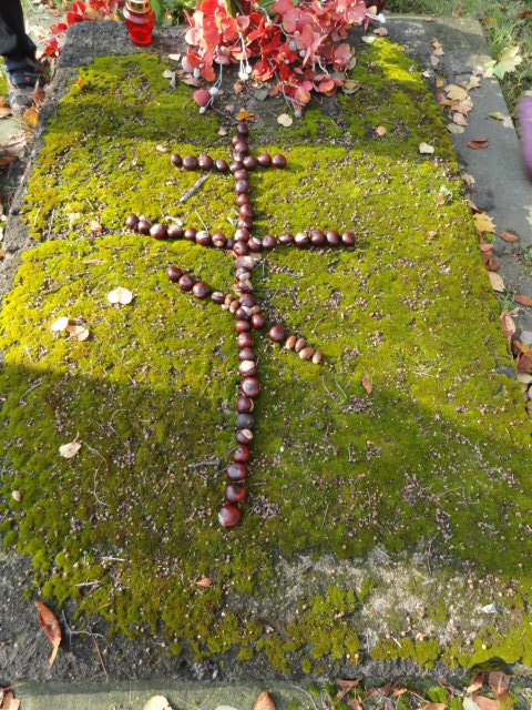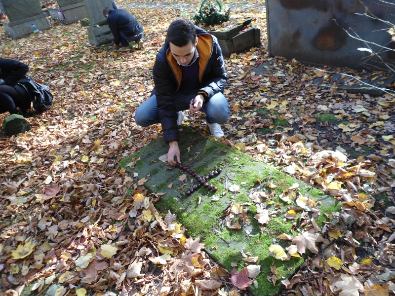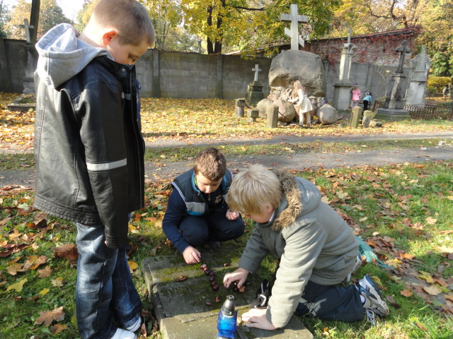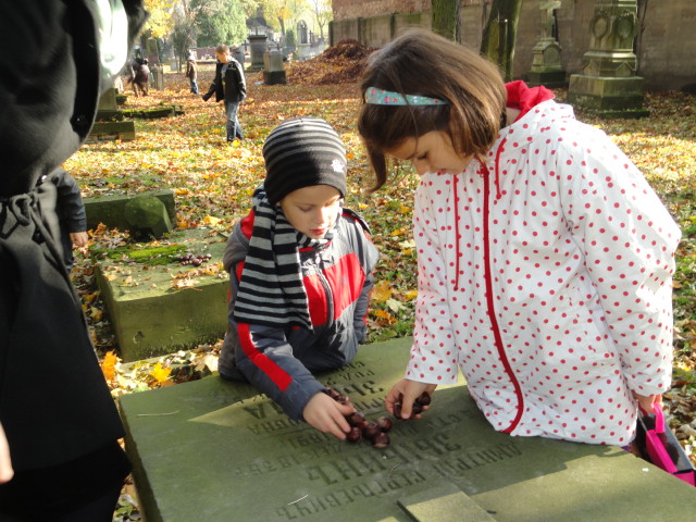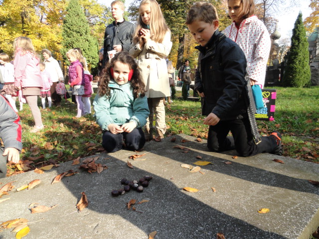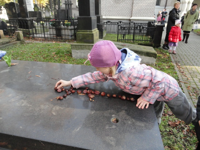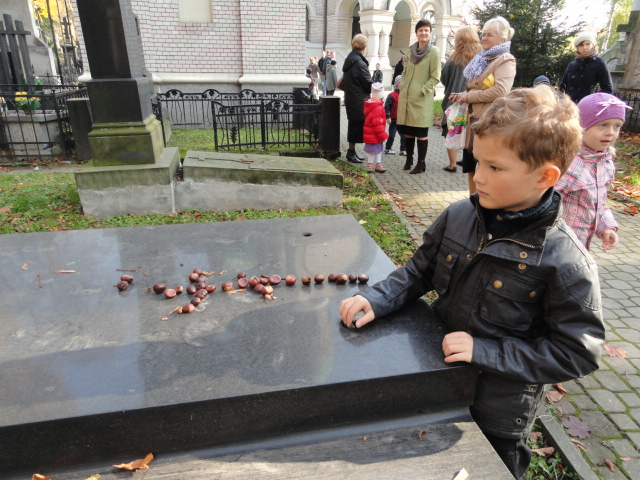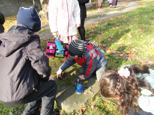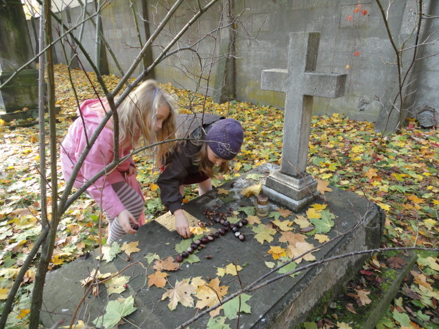W dniu dzisiejszym po lekcjach religii spotkaliśmy się przy grobie zamordowanych dzieci z parafialnego sierocińca (grób z prawej strony cerkwi). Pomodliliśmy się razem za dusze zmarłych, następnie udaliśmy się w różne zakątki naszego cmentarza, by na opuszczonych, zapomnianych grobach ułożyć krzyżyki z kasztanów. Ten symboliczny gest to przedłużenie wczorajszej modlitwy za dusze zmarłych, wyraz naszej pamięci i modlitwy za tych, których ciałem pośród nas już nie ma.