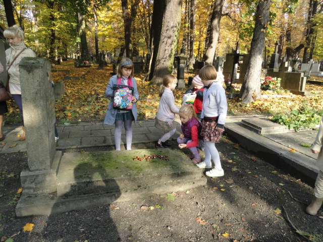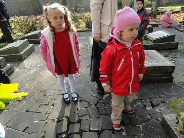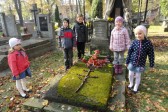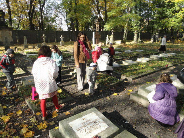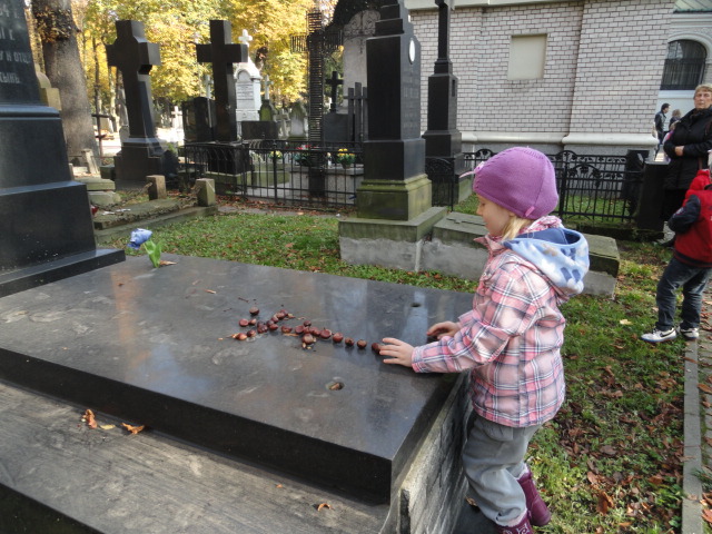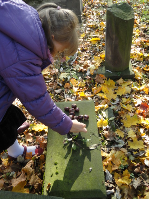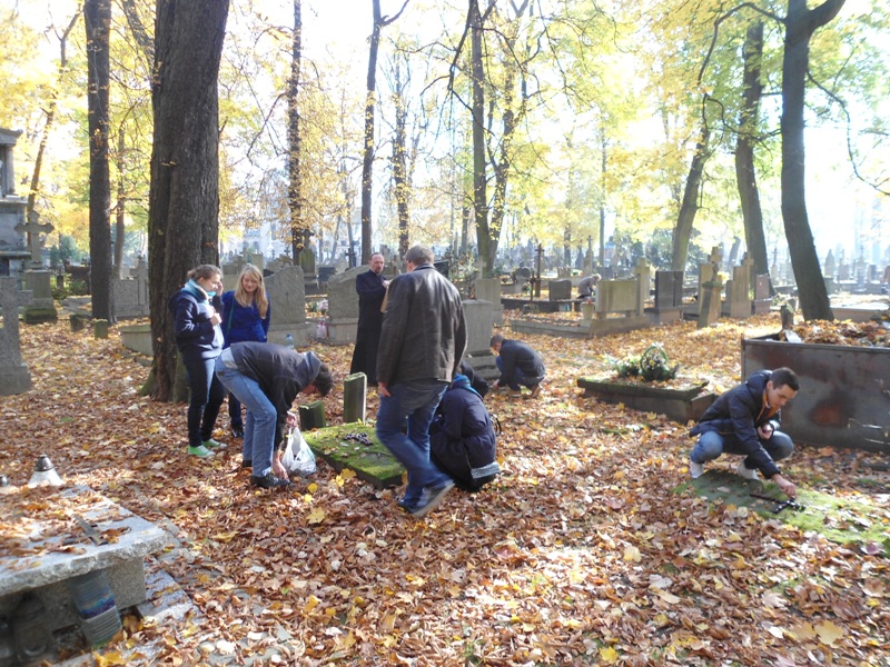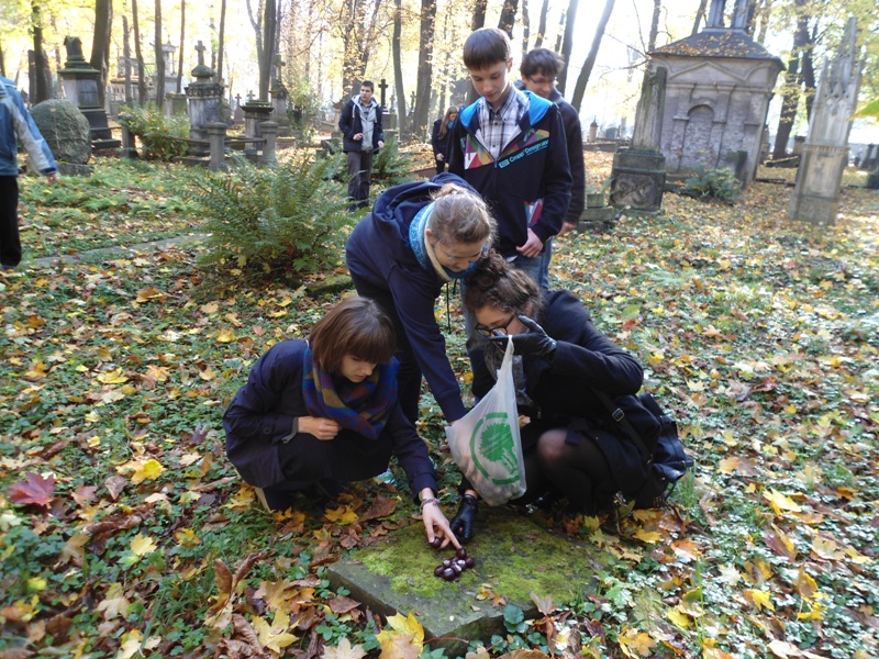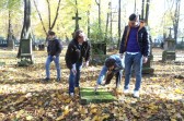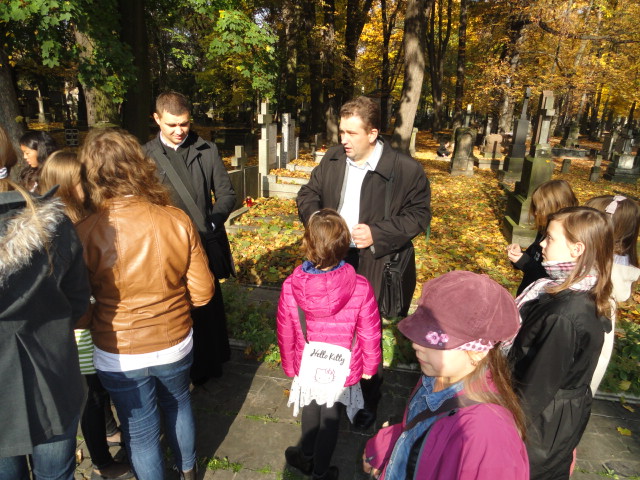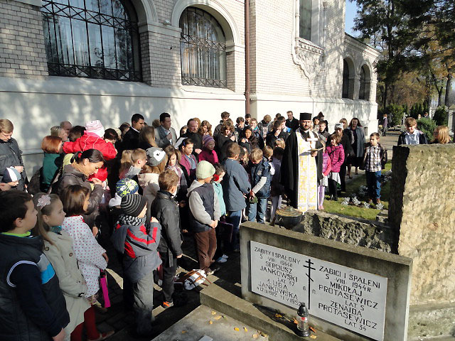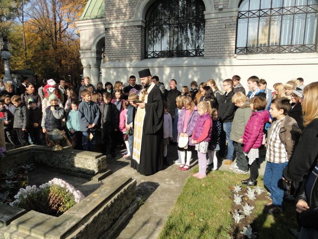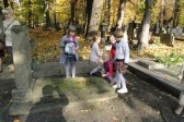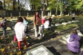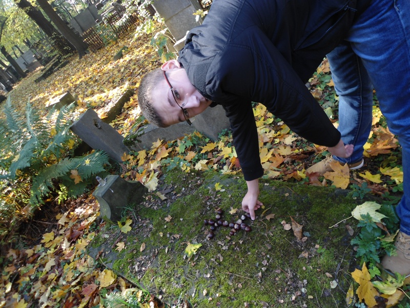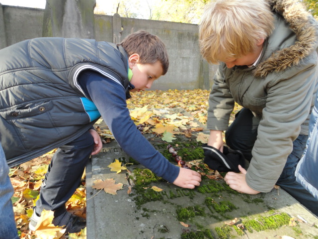 W dniu dzisiejszym po lekcjach religii spotkaliśmy się przy grobie zamordowanych dzieci z parafialnego sierocińca (grób z prawej strony cerkwi). Pomodliliśmy się razem za dusze zmarłych, następnie udaliśmy się w różne zakątki naszego cmentarza, by na opuszczonych, zapomnianych grobach ułożyć krzyżyki z kasztanów. Ten symboliczny gest to przedłużenie wczorajszej modlitwy za dusze zmarłych, wyraz naszej pamięci i modlitwy za tych, których ciałem pośród nas już nie ma.