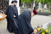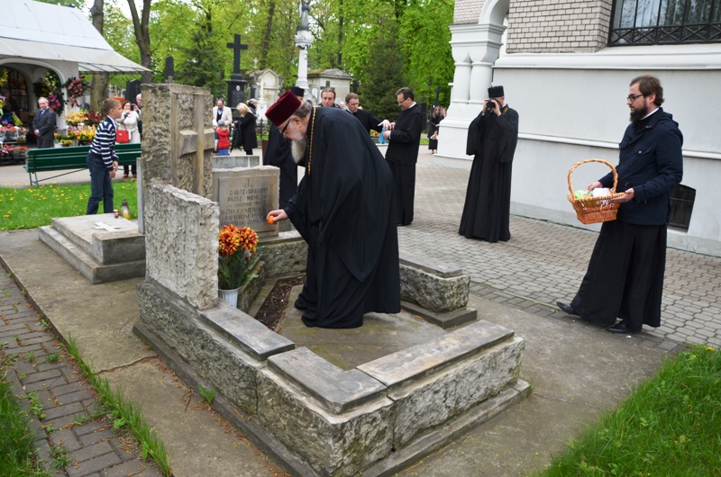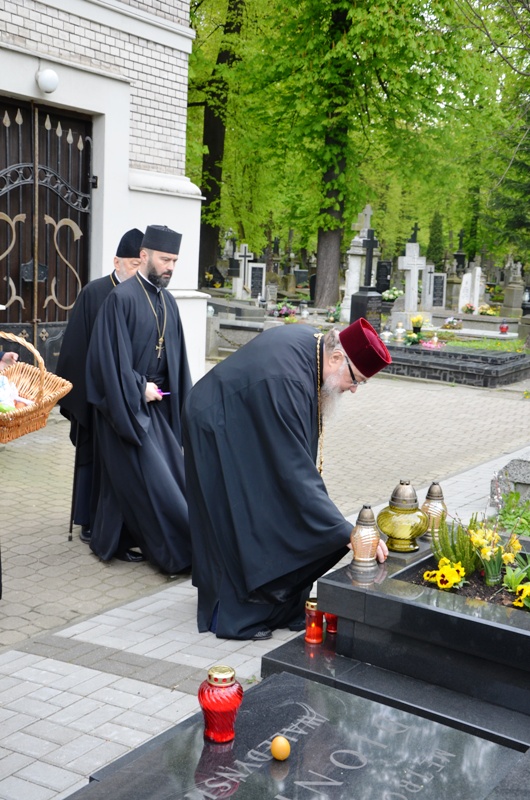 Następnie Jego Eminencja odwiedził groby min. śp. Metropolitów, duchownych, matuszek zamordowanych dzieci i personel z sierocińca parafialnego przy których odmówił krótką modlitwę i pozostawił pisankę i znicz.