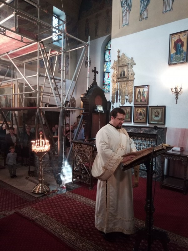 Pierwszą Liturgie św. o godzinie 8:30 w dolnej świątyni sprawował ks. Paweł Korobeinikov w asyście ks. Dawida Romanowicza oraz diakona Andrzeja Enachi. Fragment z Dziejów Apostolskich przeczytał lek. Marcin Bielawski. Perykopę ewangeliczną odczytał ks. Paweł, który wygłosił również homilię, jak również zapoznał wiernych z ogłoszeniami parafialnymi i planem nabożeństw na nadchodzący tydzień. Fragment Ewangelii w j. polskim przeczytał ks. Dawid. Chórem dyrygował lektor Bogdan Kuźmiuk.