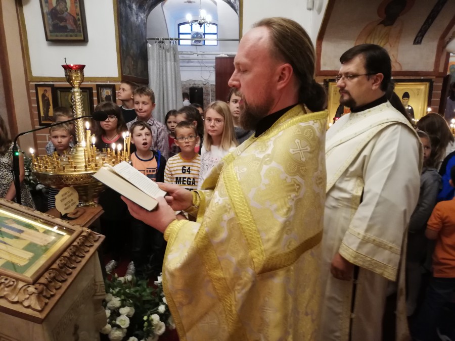 Pierwszą Boską Liturgię, rozpoczynającą rok szkolny w naszym Punkcie Katechetycznym, dla dzieci i młodzieży rozpoczęto tradycyjnie o godz. 8.30. Przewodniczył jej ks. Paweł Korobeinikov, w asyście ks. Dawida Romanowicza oraz diakona Łukasza Leonkiewicza. Homilię wygłosił ks. Paweł. Podczas nabożeństwa wznoszono szczególne prośby i modlitwy za uczniów rozpoczynjących rok szkolny. Większość z obecnych podopiecznych naszego Punktu Katechetycznego przystapiło do sakramentów Spowiedzi i Eucharystii. Chórem dyrygowała nasza nowa psalmistka i katechetka Anna Jakoniuk, którą po zakończeniu Boskiej Liturgii w ciepłych słowach przedstawił i powitał o. Paweł, po czym cała nasza Wspólnota chóralnie odśpiewała mnohaja leta nowej dyrygentce.