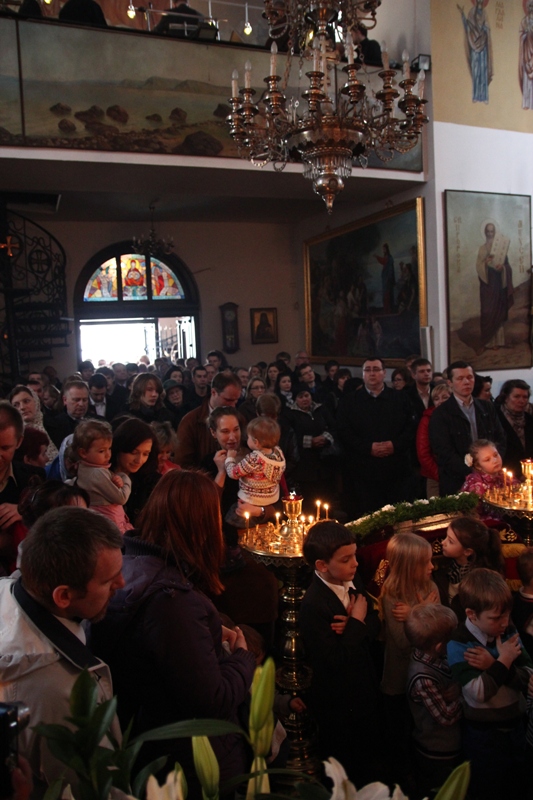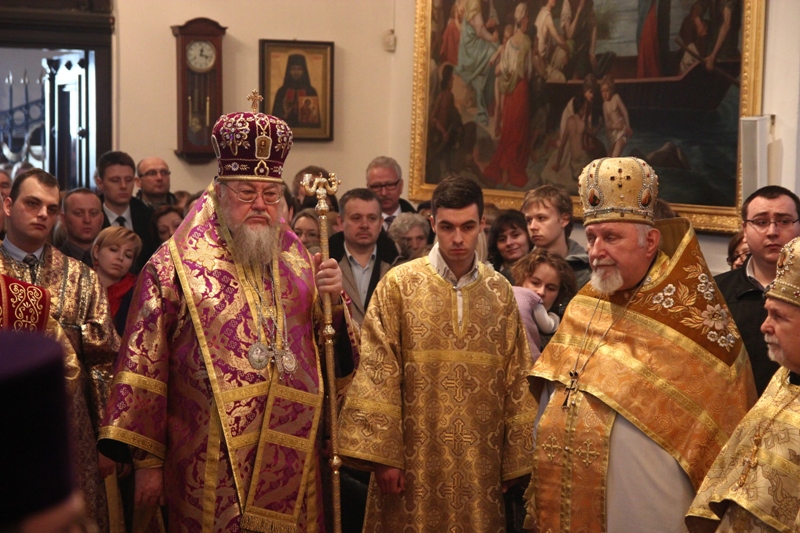 Uroczystości rozpoczęły się tuż po planowanej godzinie – 9:40 – wejściem metropolity Sawy i przywitaniem Go zgodnie ze starym chrześcijańskim obyczajem – modlitewnym śpiewem i okadzeniem. Podczas spotkania Zwierzchnika po raz pierwszy tego dnia w naszej cerkwi rozbrzmiała bogata treść troparionu św. Jana Klimaka, który został wykonany przez parafialny chór na melodię serbską pierwszego tonu. Jak przystało na święto parafialne, hymn ten został odśpiewany jeszcze kilka razy. Tu też należą się wielkie podziękowania dla naszego parafialnego chóru pod kierownictwem prof. Włodzimierza Wołosiuka, który tego dnia wspiął się na wyżyny swoich możliwości, upiększając nabożeństwo śpiewem mającym źródła w różnych tradycjach, m. in. pierwsza ektenia z greckimi odpowiedziami, Pieśń Cheruwimska czerpiąca z bułgarskiej melodii, żeńskie wykonanie hymnu do Bogurodzicy Liturgii niedziel Wielkiego Postu, czyli O Tiebie radujetsja, polifoniczne-rosyjskie śpiewy na zapriczastiu.