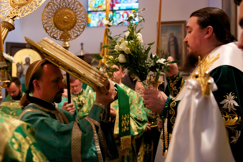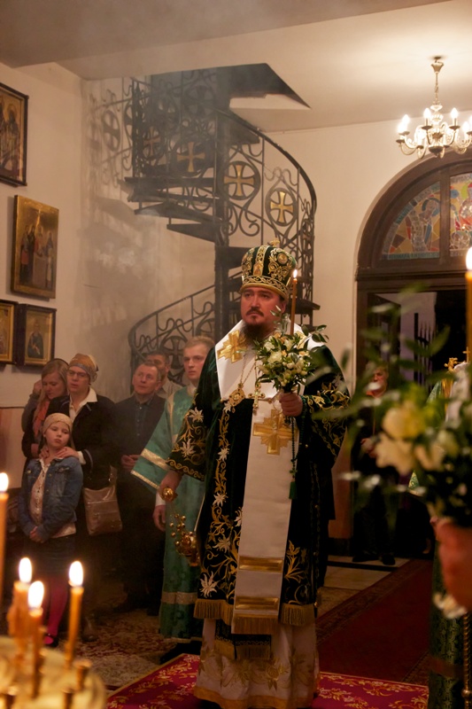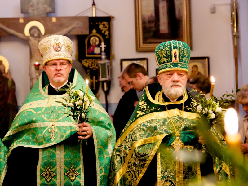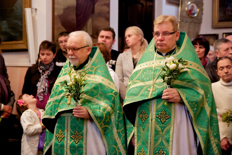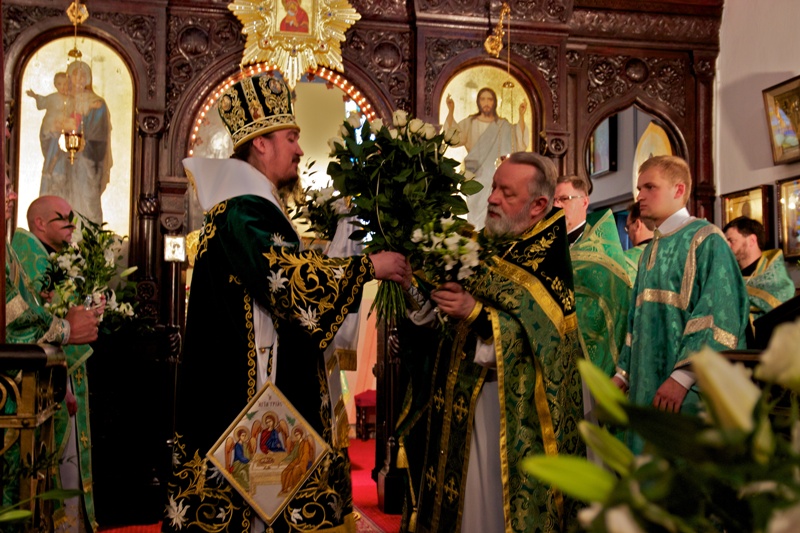 W dniu Święta Pięćdziesiątnicy, w naszej cerkwi uroczystą Świętą Liturgię celebrował, Jego Ekscelencja Jerzy, biskup siemiatycki, prawosławny ordynariusz WP, wraz z Proboszczem Parafii, ks. mitratem Mikołajem Lenczewskim, ks. mitratem Rościsławem Kozłowskim, ks. mitratem Michałem Dudiczem, ks. prot. Jarosławem Kadylakiem, ks. Piotrem Kosińskim i ks. Piotrem Rajeckim, protodiakonem Jerzym Dmitrukiem i protodiakonem Markiem Zyc-Zyckowskim. Tego dnia, jak co, roku cerkiew była przyozdobiona pięknymi i pachnącymi białymi liliami i zielonymi gałązkami. Podczas świątecznego nabożeństwa w cerkwi zebrała się ogromna liczba naszych wiernych parafian. Władyka Jerzy zwrócił się do nich z bardzo pouczającymi słowami kazania. Po Świętej Liturgii, odsłużono wieczernię. Wszyscy wsłuchiwali się w poruszające duszę i serca kolenoprykłonnyje molitwy. Po uroczystym nabożeństwie Jego Ekscelencja bp Jerzy złożył życzenia naszemu ks. proboszczowi z okazji rocznicy święceń kapłańskich. Te piękne słowa, życzeń dopełnił chór, rozbrzmiewającym radośnie Mnogaja Leta.