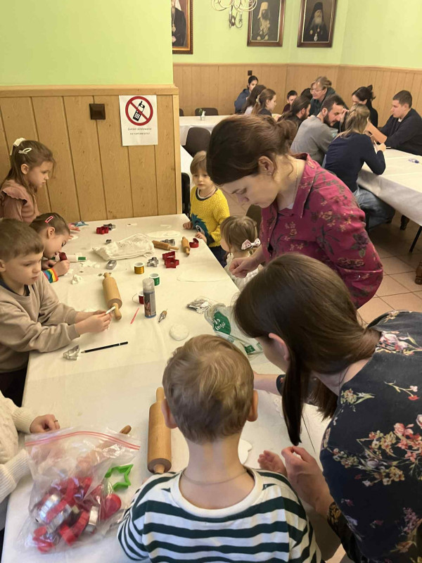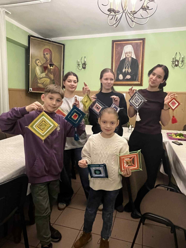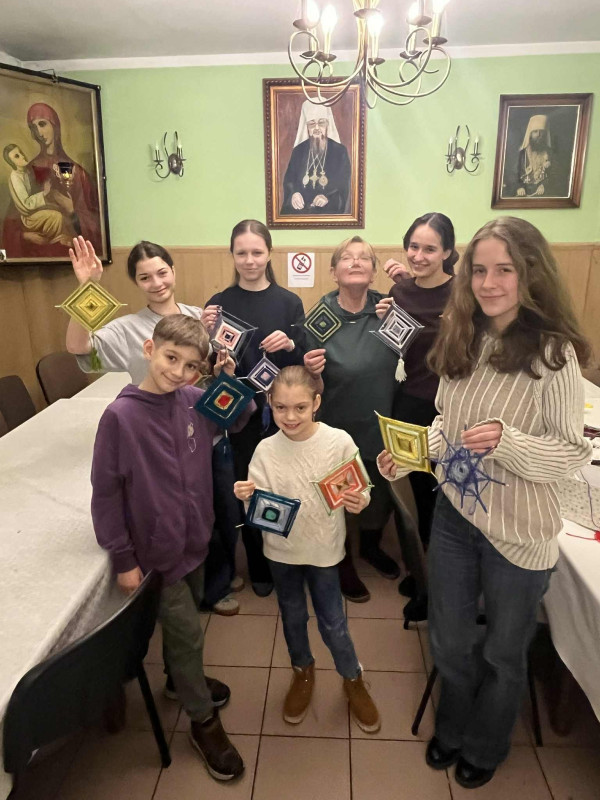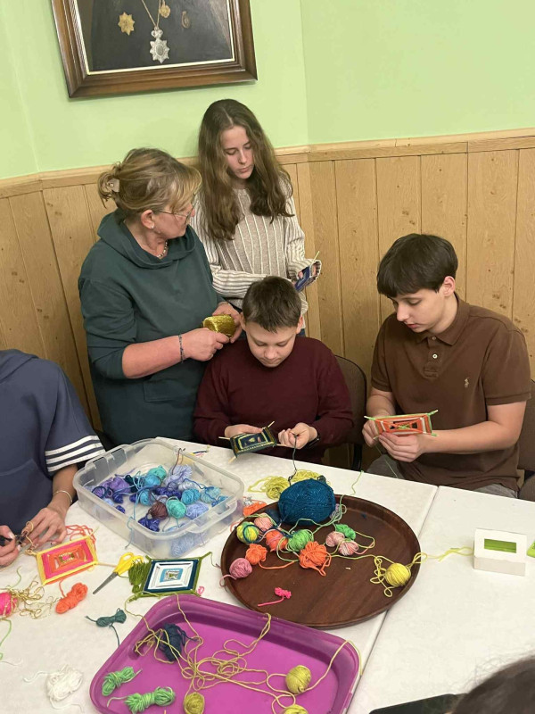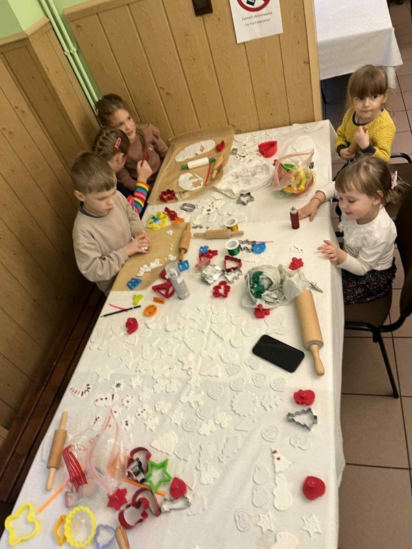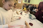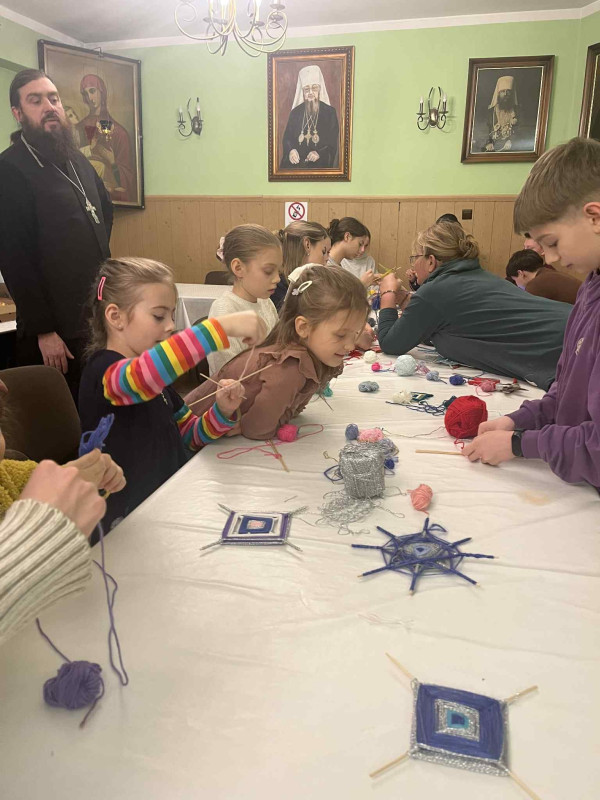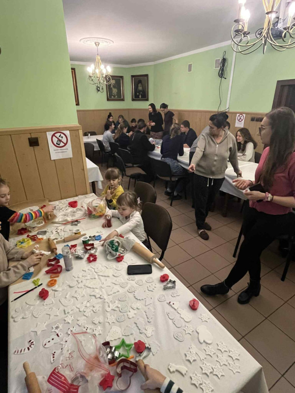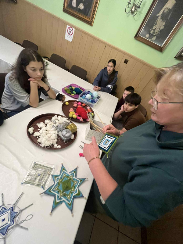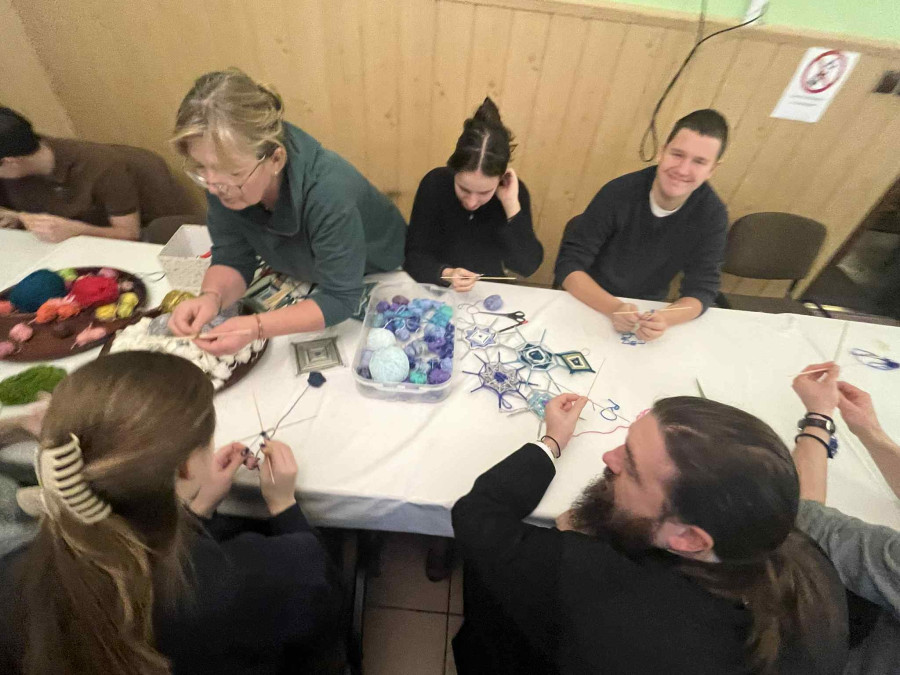 Podzieleni na dwie drużyny, pod okiem pani Ludmiły Miłowanow i katechetów szykowaliśmy rękodzieła. Młodsi wytwarzali zawieszki choinkowe z masy solnej, a następnie ozdabiali je kolorowymi koralikami i posypkami, natomiast starsza grupa w skupieniu zaplatała gwiazdy z włóczki. Wkrótce także i młodsi zaintrygowani pracą włókienniczą dołączyli do stołu pełnego tekstylii i podjęli się plecionek.
