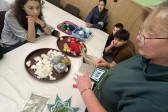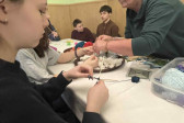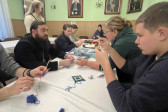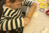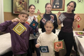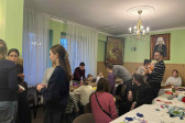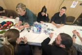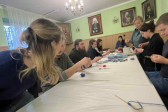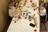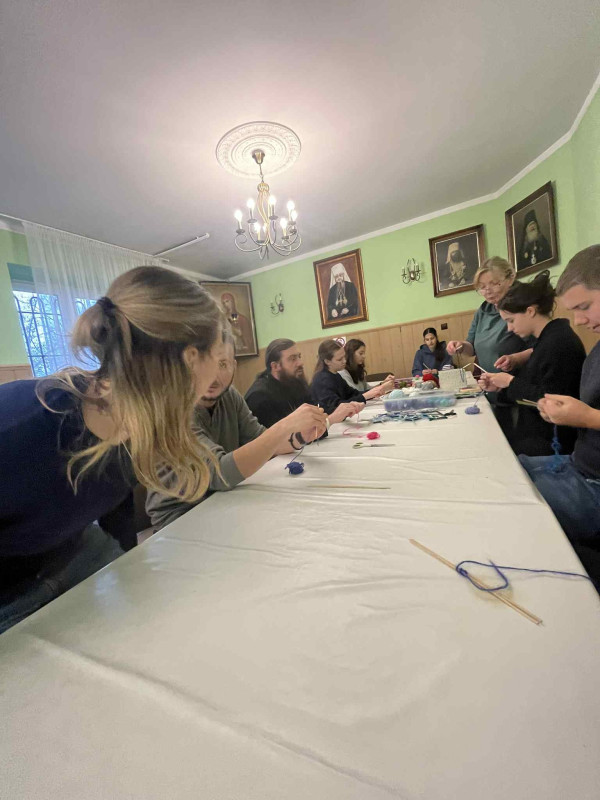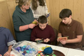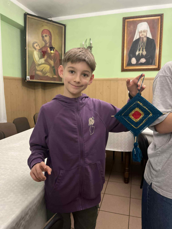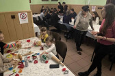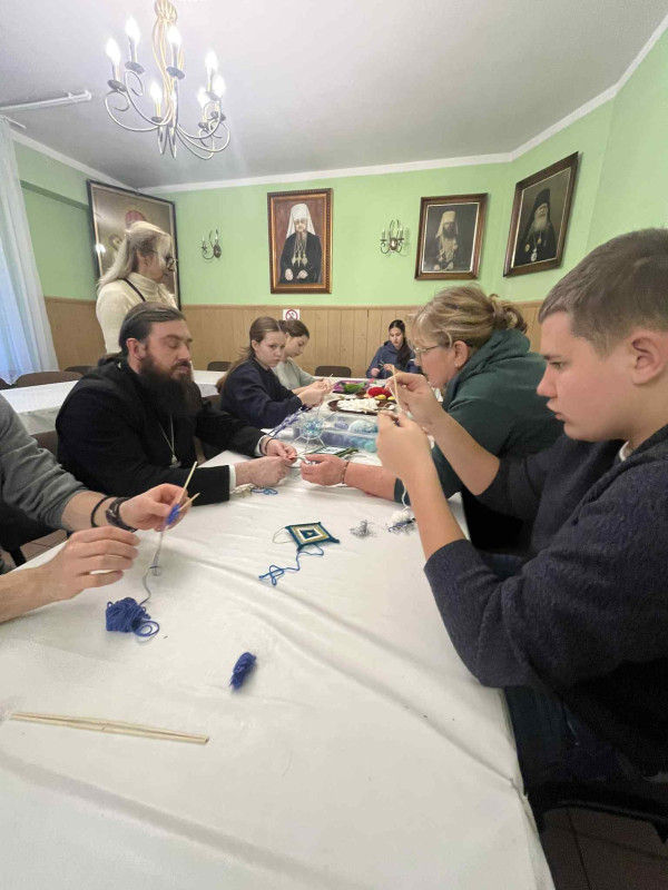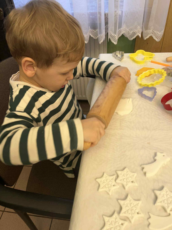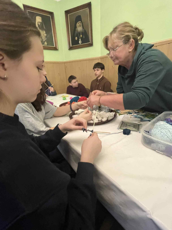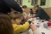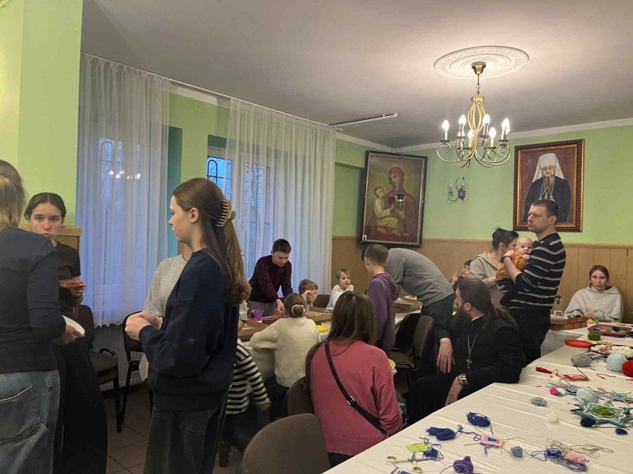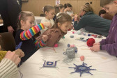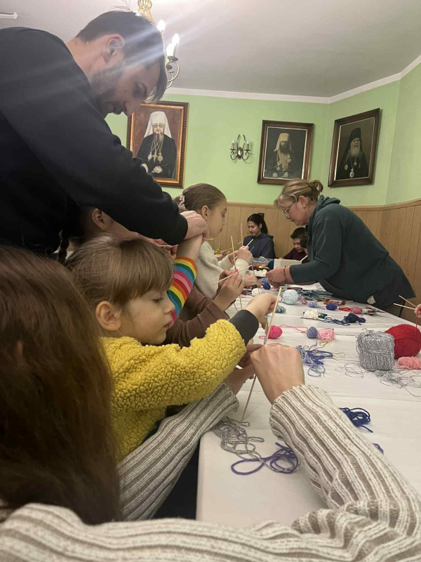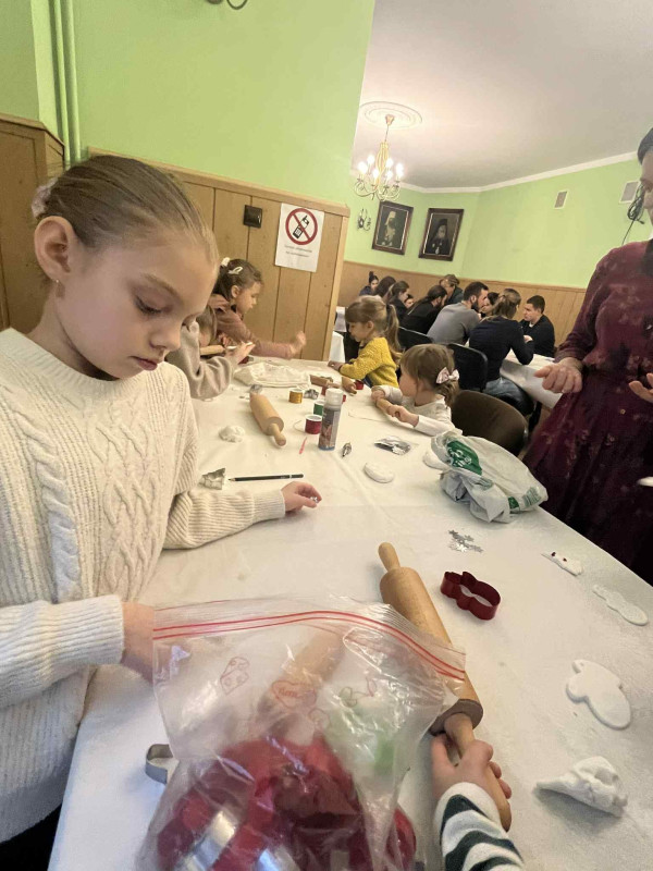 Podzieleni na dwie drużyny, pod okiem pani Ludmiły Miłowanow i katechetów szykowaliśmy rękodzieła. Młodsi wytwarzali zawieszki choinkowe z masy solnej, a następnie ozdabiali je kolorowymi koralikami i posypkami, natomiast starsza grupa w skupieniu zaplatała gwiazdy z włóczki. Wkrótce także i młodsi zaintrygowani pracą włókienniczą dołączyli do stołu pełnego tekstylii i podjęli się plecionek.
