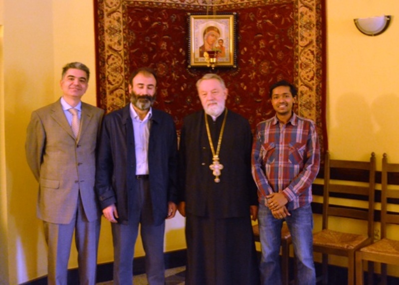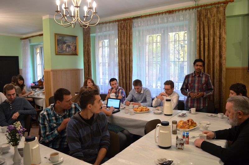 Jednak zanim jeszcze rozpoczęliśmy pierwsze spotkanie po przerwie wakacyjnej, wszyscy jego uczestnicy wraz z ks. proboszczem stanęli do pamiątkowego zdjęcia przed plebanią, na której w dużej sali katechetycznej co niedziela integrujemy się i zgłębiamy prawosławie. Dzisiejsze spotkanie było wyjątkowe jeszcze z kilku innych powodów. Po pierwsze, swoją obecnością zaszczycił nas właśnie o. Mikołaj, który naszych studentów bardzo wspiera. Po drugie, mieliśmy trochę niecodziennych zagranicznych gości, tzn. na te spotkanie zawsze uczęszcza ktoś zza wschodniej granicy, lecz tym razem przybyli także dwaj młodzi duchem Grecy, a także prawosławny Indus prosto z Kerali – stanu Indii, do którego, jak sam opowiedział nasz brat w wierze, z misją dotarł już sam apostoł Tomasz, i po dziś dzień wielu jego mieszkańców to wierni Cerkwi malankarskiej.