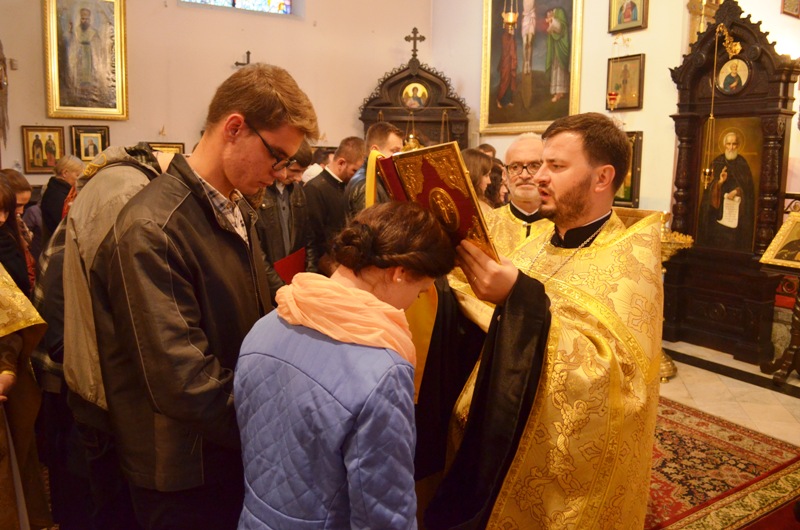 Na koniec nabożeństwa każdy tradycyjnie podchodził do krzyża, a ponadto wyjątkowo był kropiony wodą święconą na błogosławieństwo. Obrzędu tego dokonywał o. Tomasz Stempa, który prowadzi coniedzielne spotkania prawosławnych studentów oraz osób w wieku okołostudenckim – tak naprawdę zaproszonym może czuć się każdy, kto ukończył szkołę średnią, a zarazem czuje się młodo i chce czegoś więcej dowiedzieć się o swoim wyznaniu, albo po prostu poznać nowych ludzi wyznających te same wartości w przyjaznej, niesztywnej atmosferze.