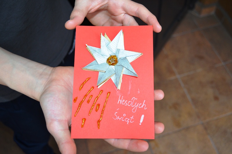 Tym razem nasze przygotowania były ubogacone nauką orgiami - sztuki składania papieru. Wykonane tym sposobem różne gwiazdki przyozdobiły kartki świąteczne.