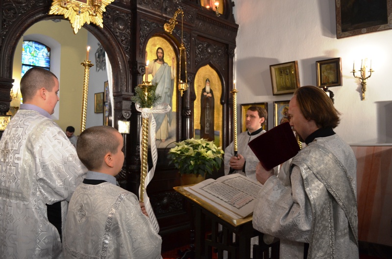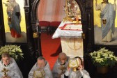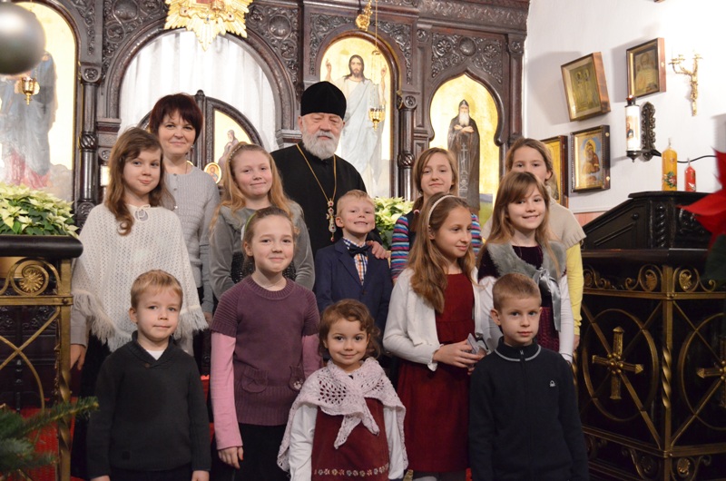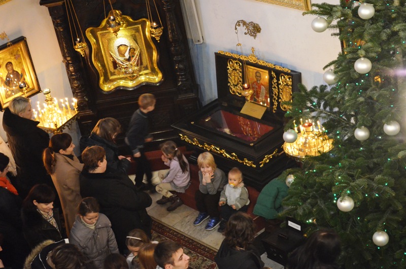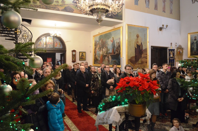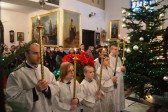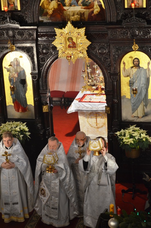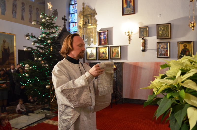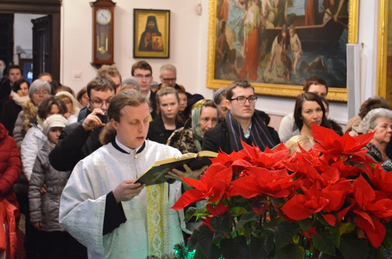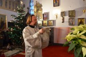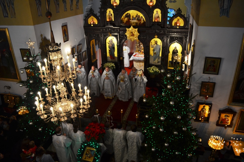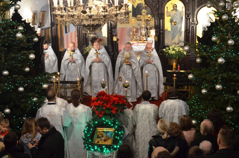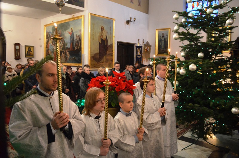 Niedzielnej Boskiej Liturgii przewodniczył proboszcz wolskiej parafii – ks. mitrat Mikołaj Lenczewski. Współcelebrantami byli księża: mitrat Rościsław Kozłowski, prot. Jarosław Kadylak, prot. Piotr Kosiński, prot. Piotr Rajecki (dzisiejszy kaznodzieja) i ks. Tomasz Stempa. Posługę diakońską pełnili księża protodiakoni: Marek Zyc-Zyckowski i Paweł Korobejnikow. Śpiewał chór – dzisiaj w męskim składzie – pod dyrygenturą pana prof. Włodzimierza Wołosiuka. Na zakończenie Boskiej Liturgii na środku cerkwi zebrało się duchowieństwo, aby pokłonić się ikonie Narodzenia Pańskiego oraz wysłuchać kolęd, które zaśpiewał chór dziecięcy dyrygowany przez matuszkę Dorotę Korobejnikow.