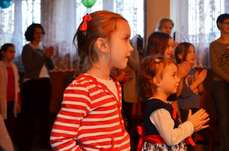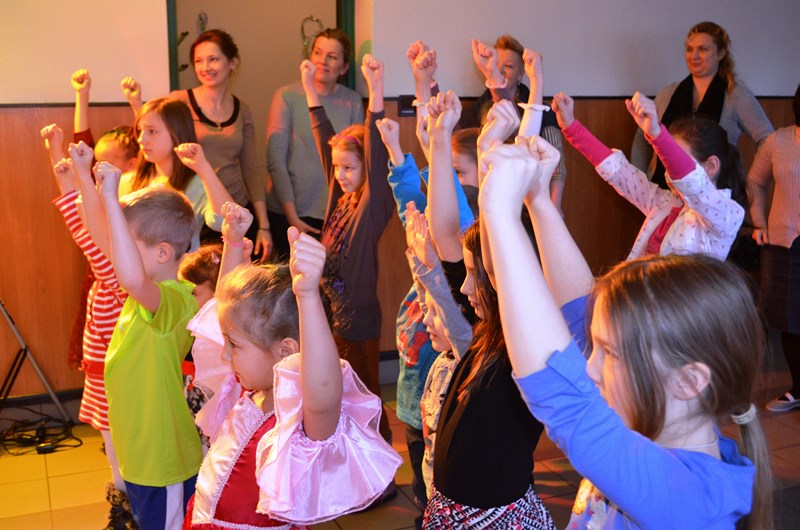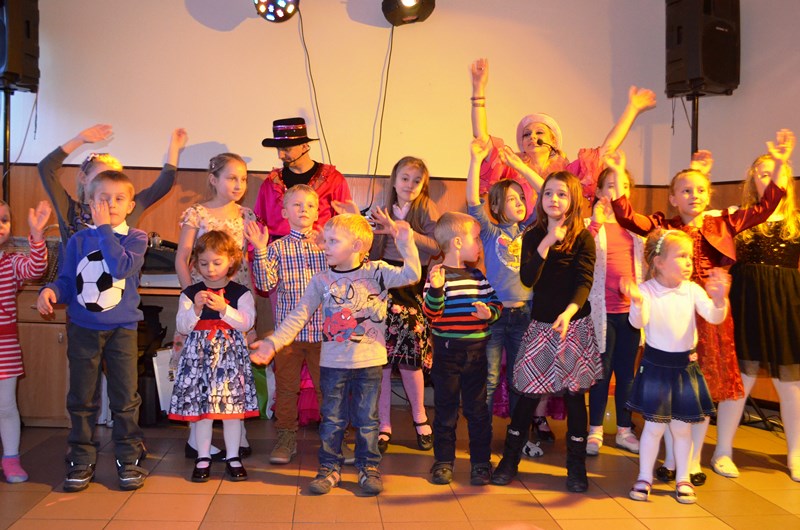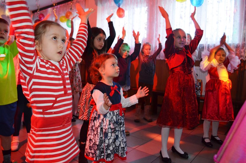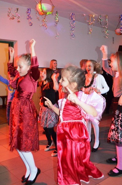 Młodsze dzieci (przedszkole i szkoła podstawowa) spotkały się w sobotnie popołudnie. Nasi najmłodsi bawili się już bardziej tradycyjnie, ale atmosfera podczas zabawy była niezwykła i niezapomniana. Wszystko za sprawą Teatru Złoty Dukat. Prowadzenie zabawy było bardzo profesjonalne, wesołe i wciągające w nią wszystkich obecnych nawet tych którzy zazwyczaj takie zabawy obserwują z ławek pod ścianą. Zabawy i tańce były urozmaicone różnymi konkursami z nagrodami. Do roztańczonych i rozbawionych dzieci przyłączyli się również rodzice.