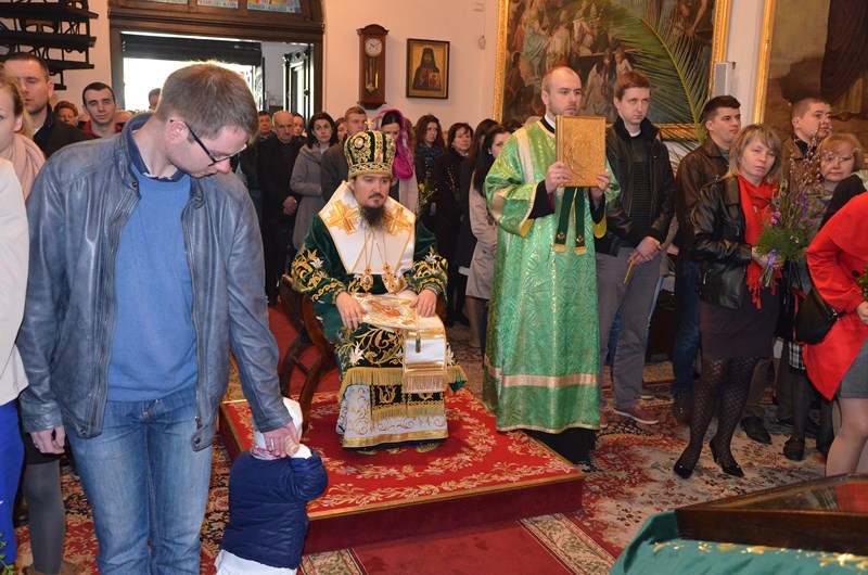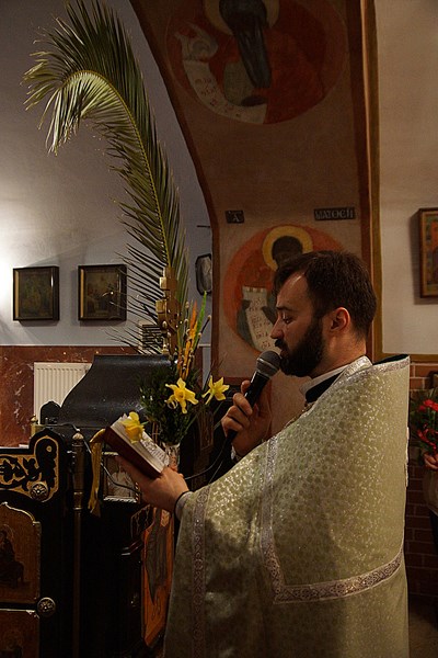 Na zapriczastnom ks. prot. Piotr Kosiński przede wszystkim serdecznie podziękował Jego Ekscelencji, Biskupowi Jerzemu za przewodnictwo w dzisiejszej Świętej Liturgii oraz we wczorajszym nabożeństwie wieczornym, a następnie zapoznał wszystkich licznie dziś zebranych w naszej świątyni wiernych z harmonogramem nabożeństw sprawowanych w naszej Cerkwi w Wielkim Tygodniu.