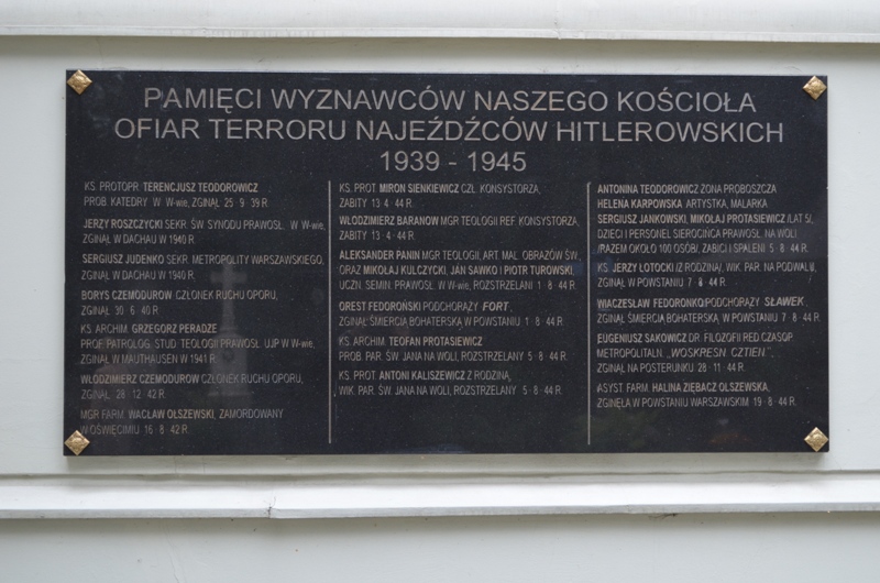 W trakcie działań wojennych zginęło wielu znanych i zasłużonych dla Ojczyzny prawosławnych mieszkańców Stolicy. Imiona rozpoznanych ofiar zostały uwiecznione na tablicy pamiątkowej umieszczonej na murze świątyni, po stronie zachodniej, na prawo od wejścia.