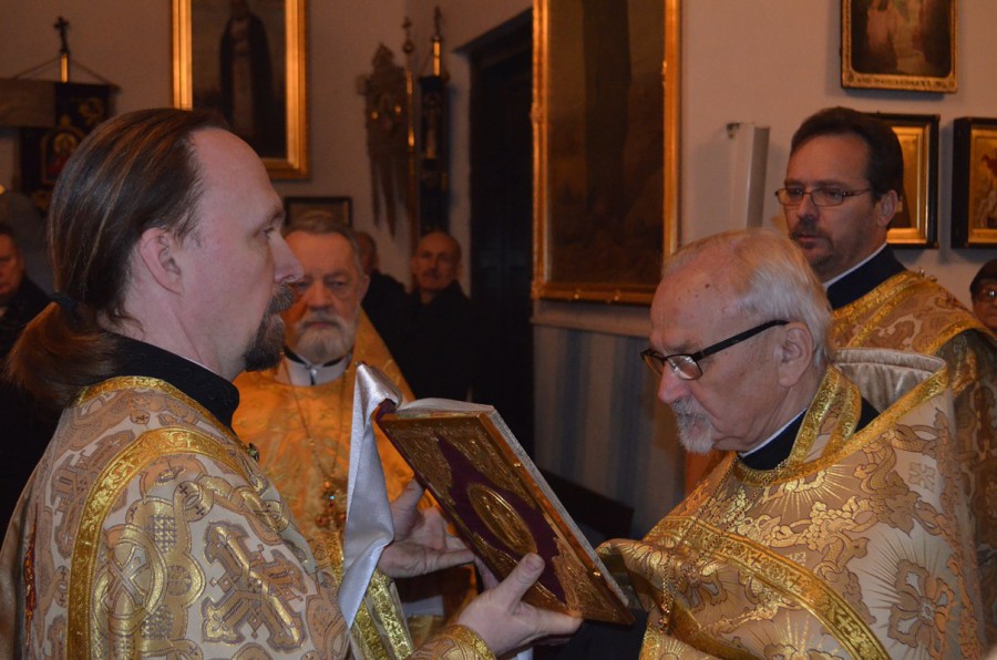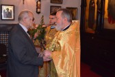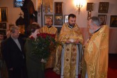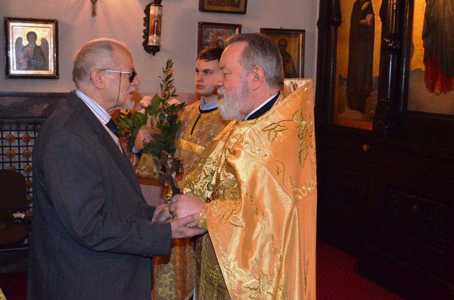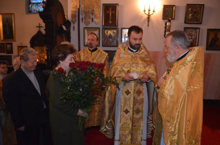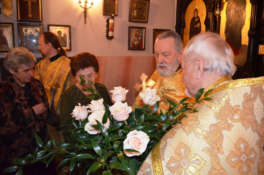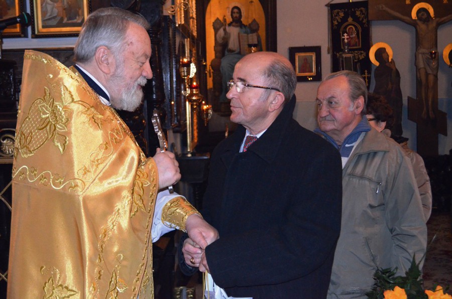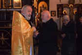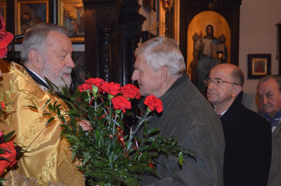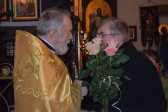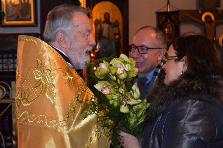Po tym, ks. mitrat Anatol Szydłowski, złożył w imieniu swoim i wszystkich obecnych płynące z głębi serca życzenia Proboszczowi naszej Parafii – ks. mitratowi Mikołajowi Lenczewskiemu, życząc mu przede wszystkim Błogosławieństwa Bożego, sił duchowych i cielesnych oraz wszelkich Łask Bożych na kolejne lata pełnienia jakże, chwilami, trudnej posługi kapłańskiej. Następnie głos zabrał sam solenizant, który w ciepłych i pełnych życzliwości słowach serdecznie podziękował ks. Anatolowi za życzenia, całemu duchowieństwu za współcelebrowanie dzisiejszego nabożeństwa, chórowi za piękny śpiew, naszym parafianom oraz wszystkim tym, którzy znaleźli dziś czas, aby przyjść do naszej Cerkwi i modlitewnie uczcić pamięć Świętego Mikołaja Cudotwórcy. Po tym, zgodnie z tradycją, nadszedł moment, kiedy przy całowaniu krzyża każdy z wiernych mógł, osobiście złożyć życzenia imieninowe naszemu drogiemu ks. Mikołajowi.