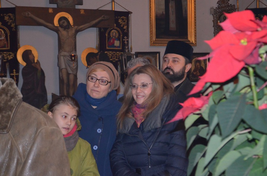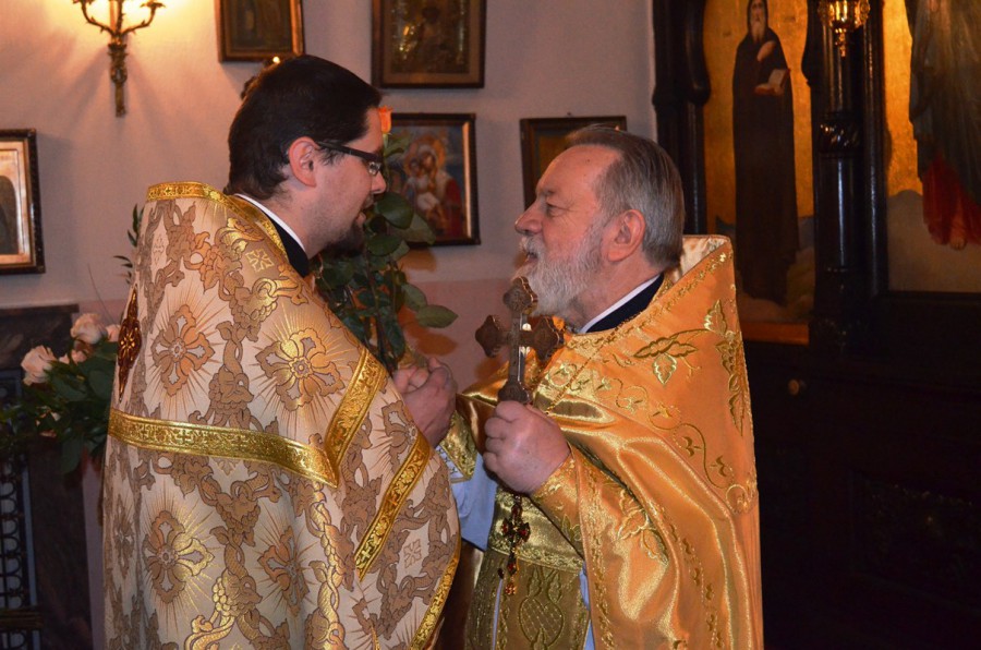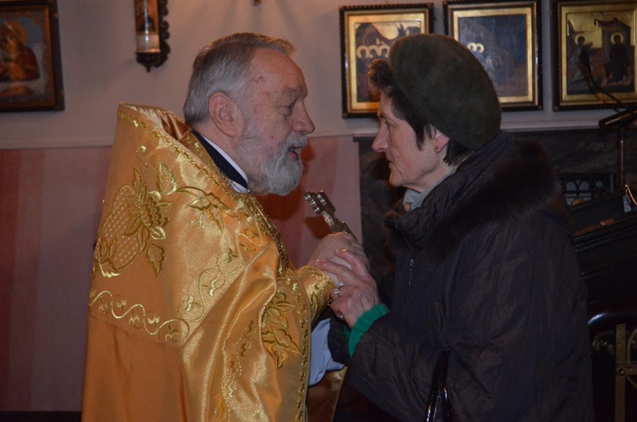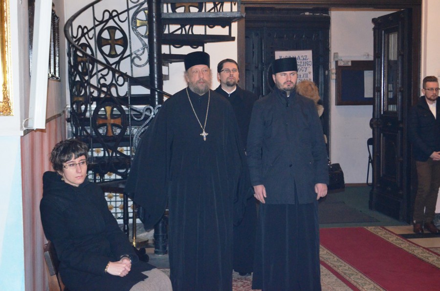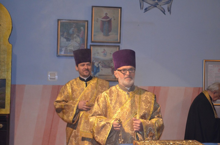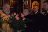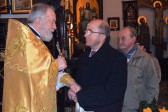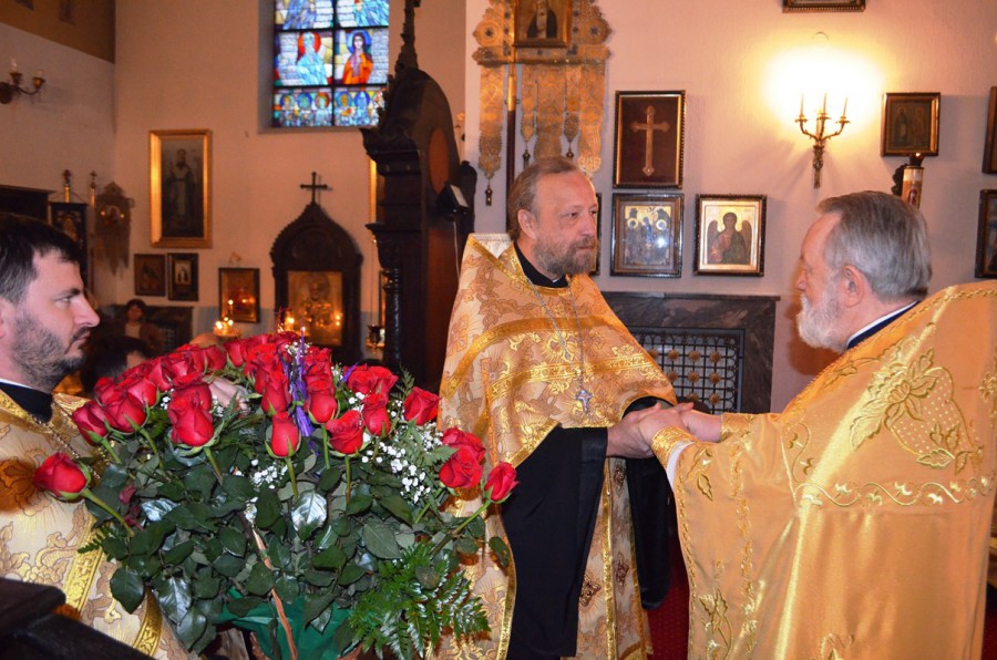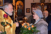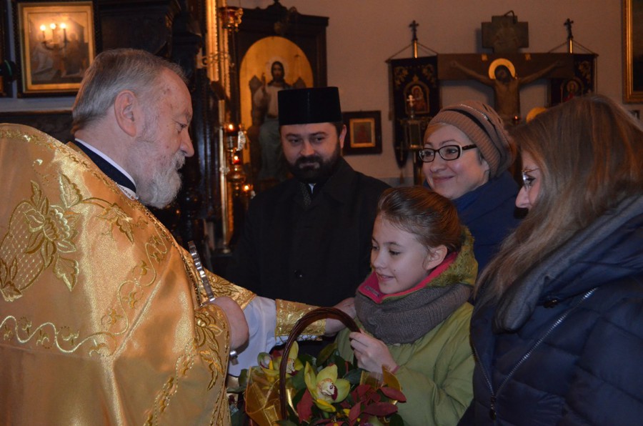 Po tym, ks. mitrat Anatol Szydłowski, złożył w imieniu swoim i wszystkich obecnych płynące z głębi serca życzenia Proboszczowi naszej Parafii – ks. mitratowi Mikołajowi Lenczewskiemu, życząc mu przede wszystkim Błogosławieństwa Bożego, sił duchowych i cielesnych oraz wszelkich Łask Bożych na kolejne lata pełnienia jakże, chwilami, trudnej posługi kapłańskiej. Następnie głos zabrał sam solenizant, który w ciepłych i pełnych życzliwości słowach serdecznie podziękował ks. Anatolowi za życzenia, całemu duchowieństwu za współcelebrowanie dzisiejszego nabożeństwa, chórowi za piękny śpiew, naszym parafianom oraz wszystkim tym, którzy znaleźli dziś czas, aby przyjść do naszej Cerkwi i modlitewnie uczcić pamięć Świętego Mikołaja Cudotwórcy. Po tym, zgodnie z tradycją, nadszedł moment, kiedy przy całowaniu krzyża każdy z wiernych mógł, osobiście złożyć życzenia imieninowe naszemu drogiemu ks. Mikołajowi.