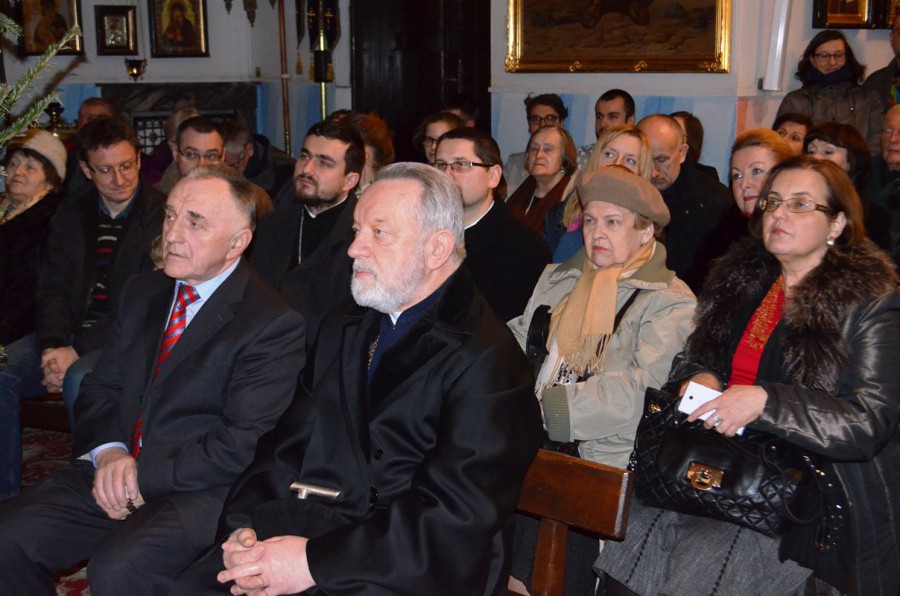 Jednakże nie tylko wyżej wymienieni artyści śpiewali na tym koncercie. Na osobne wyróżnienie zasługuje tu postać Antosia Bortniczuka – małego parafianina, który przy żeńskim chórze służącym tu jako tło niesamowicie poruszająco wykonał chyba najbardziej popularną na świecie kolędę: Cichą Noc. Można by wiele napisać na temat tego śpiewu, a i tak pewnie by to nie oddało istoty… W każdym razie, głos małego dziecka tak się wpisuje w to przedwieczne zamierzenie Boże, by Ten stał się małym dzieckiem właśnie, dla naszego zbawienia… Głos śpiewający szczerze, słabiej pod względem dźwięku, a mocniej w przesłaniu niż cały chór… Cichość – widać, a właściwie, to słychać, że to jeden z przymiotów Boga; tak odległy od tej ruchliwej i głośnej Marszałkowskiej, ulic naszego życia, o czym wspomniał proboszcz parafii – ks. mitrat Mikołaj Lenczewski – prosząc o bis tej kolędy. Duchowny na koniec koncertu w swych żywiołowych i otwartych słowach powiedział osobiście – wyrażając jednocześnie odczucia chyba każdego, czego również można domyśleć się z początku tej relacji – czym są kolędy. Wyraził podziękowanie dla wszystkich organizatorów i występujących, zaśpiewano tradycyjne Mnogaja ljeta, po czym proboszcz zaprosił do wspólnego śpiewu wszystkim zgromadzonych – jak napisano, nie tylko wyćwiczeni w fachu śpiewali na tym koncercie. Tak więc wszyscy zebrani niejako utworzyli trzeci chór, i wszyscy zaśpiewali kolędy: Do szopy hej pasterze, Wśród nocnej ciszy (znowu ta poruszająca, mocna w wyrazie „cisza”!) i, na sam koniec, tak potężne, pełne Bożego paradoksu Bóg się rodzi.