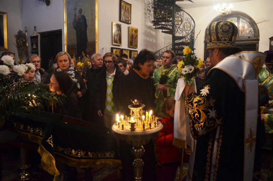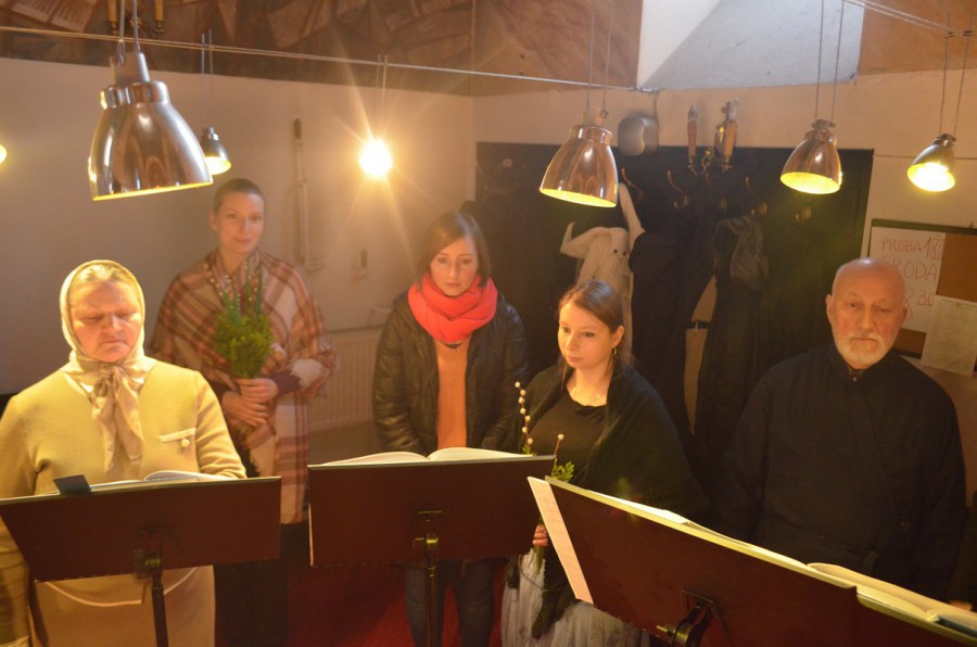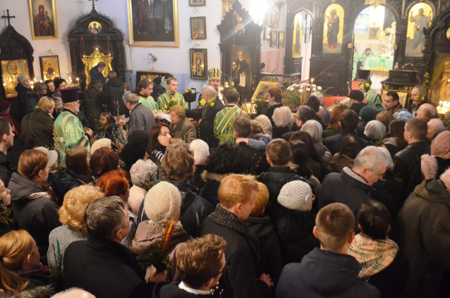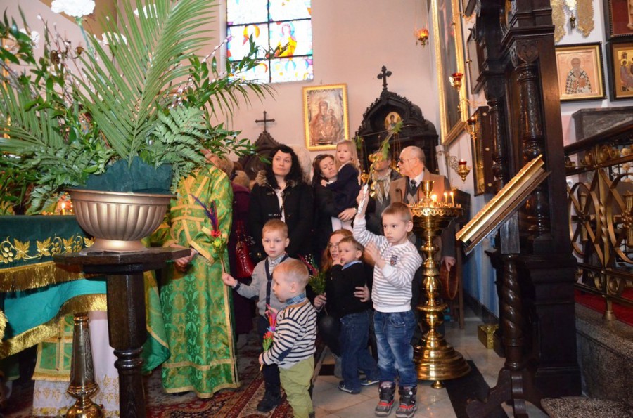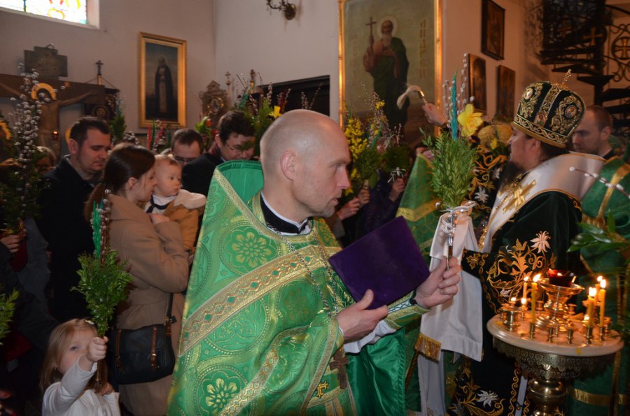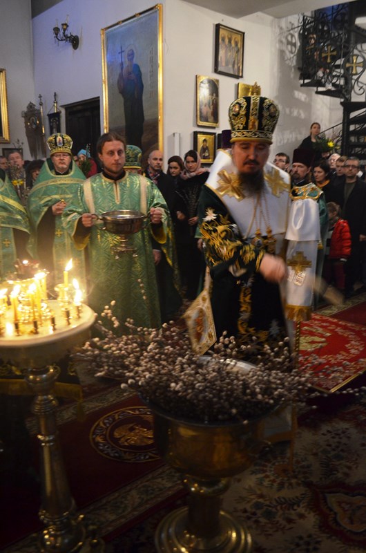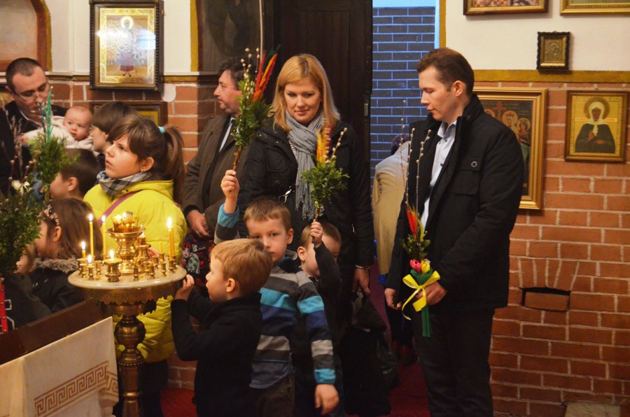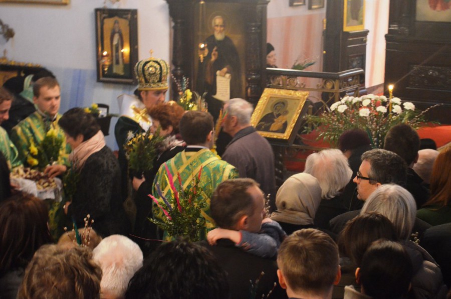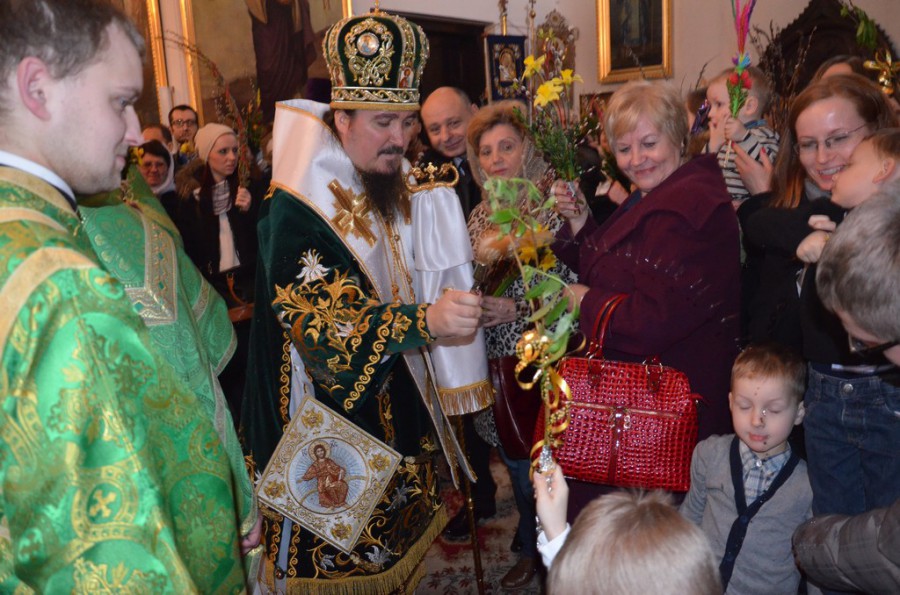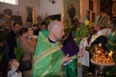 Po końcowym rozesłaniu chór odśpiewał troparion, kondakion oraz megalitarion święta, po czym Władyka Jerzy przeczytał modlitwę na poświęcenie gałązek palmowych. Następnie obszedł całą cerkiew kropiąc święconą wodą palemki, które wierni przynieśli dzisiaj ze sobą do świątyni.