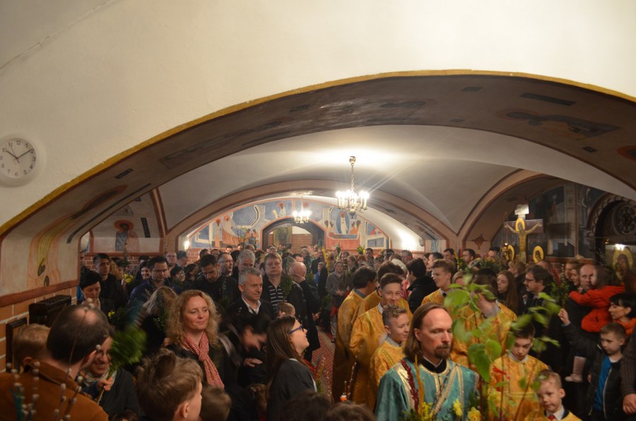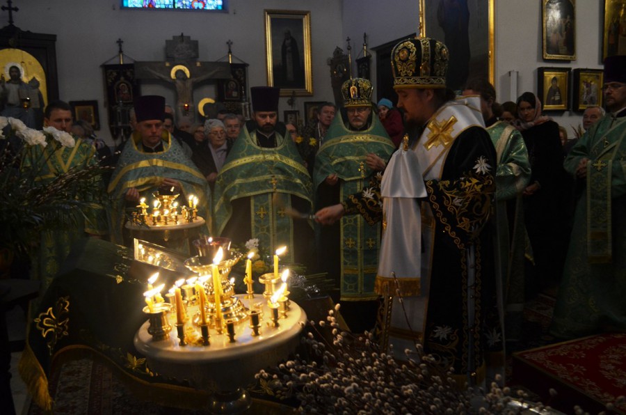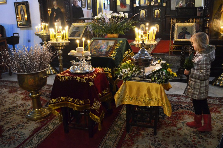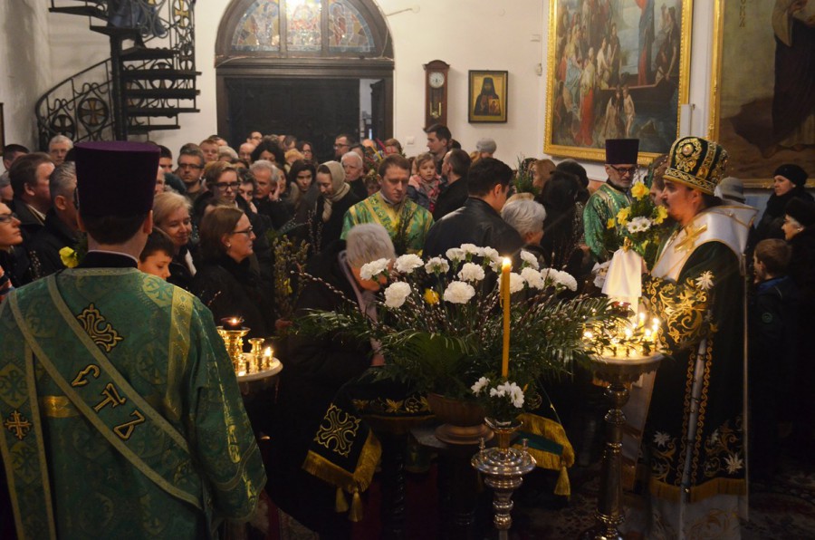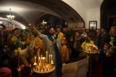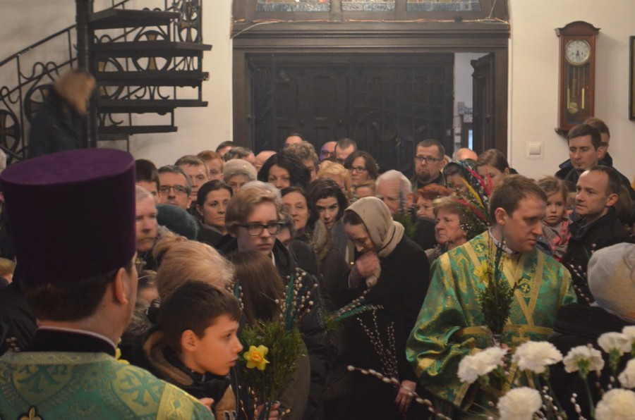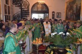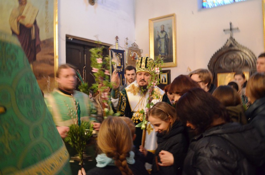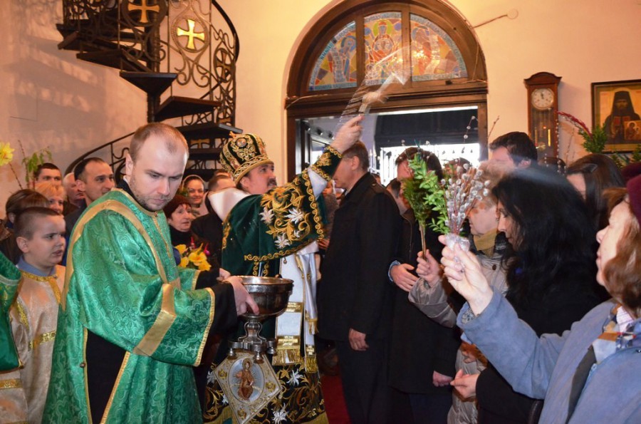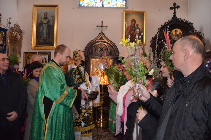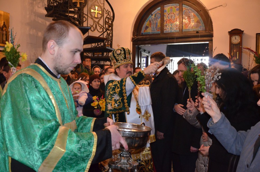 Po końcowym rozesłaniu chór odśpiewał troparion, kondakion oraz megalitarion święta, po czym Władyka Jerzy przeczytał modlitwę na poświęcenie gałązek palmowych. Następnie obszedł całą cerkiew kropiąc święconą wodą palemki, które wierni przynieśli dzisiaj ze sobą do świątyni.