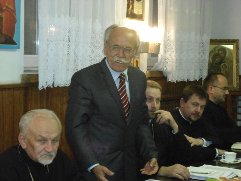 Następnie pan dr Jan Zieniuk - Dyrektor Metropolii ds. Nauczania Religii Prawosławnej, omówił ogólną sytuację nauczania religii w Polsce i ukazał odniesione sukcesy. Wskazał również na wyzwania stojące przed nauczycielami religii, celem których jest reagowanie na bieżące problemy w pracy dydaktycznej. Podkreślił, że wszyscy powinniśmy zastanowić się jakie działania należy podejmować, by jeszcze bardziej ubogacić i urozmaicić pracę z dziećmi i młodzieżą. Pan Zieniuk przedstawił i omówił nowe zarządzenia dotyczące nauczania religii.