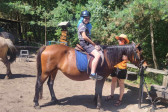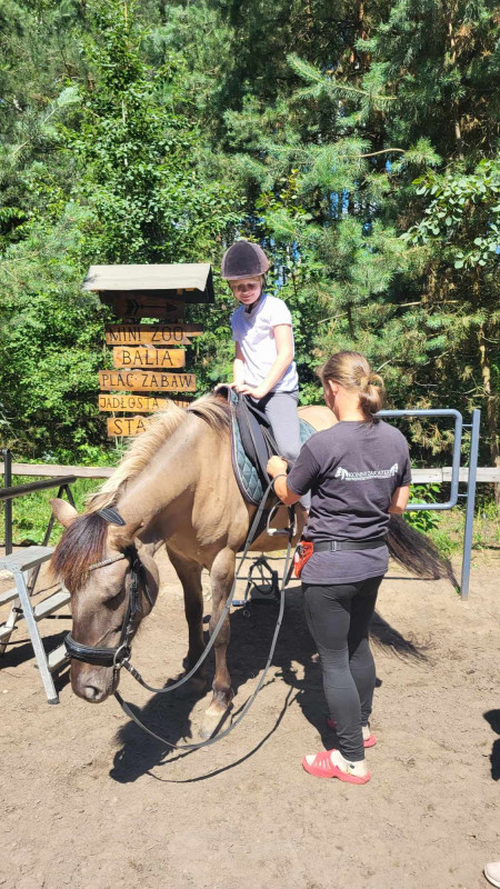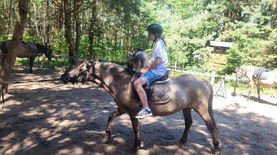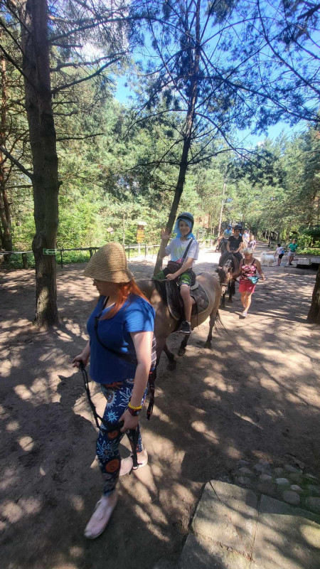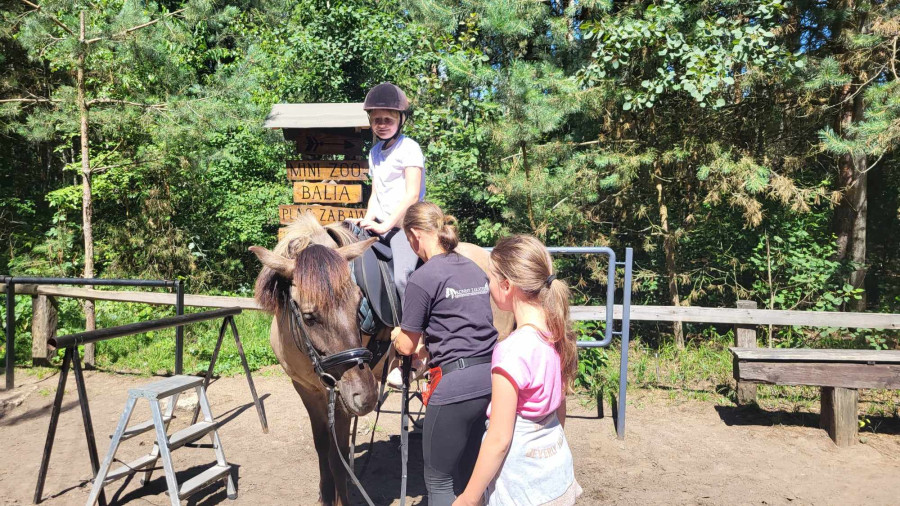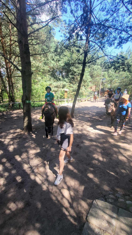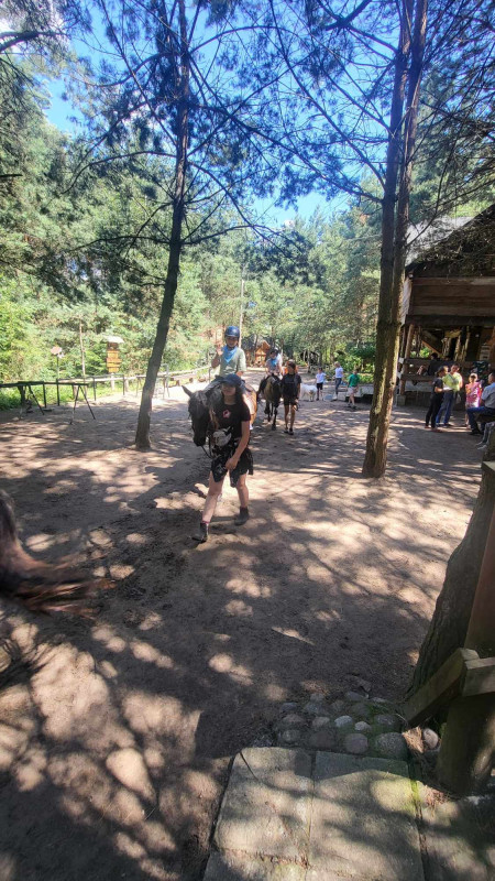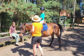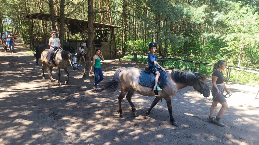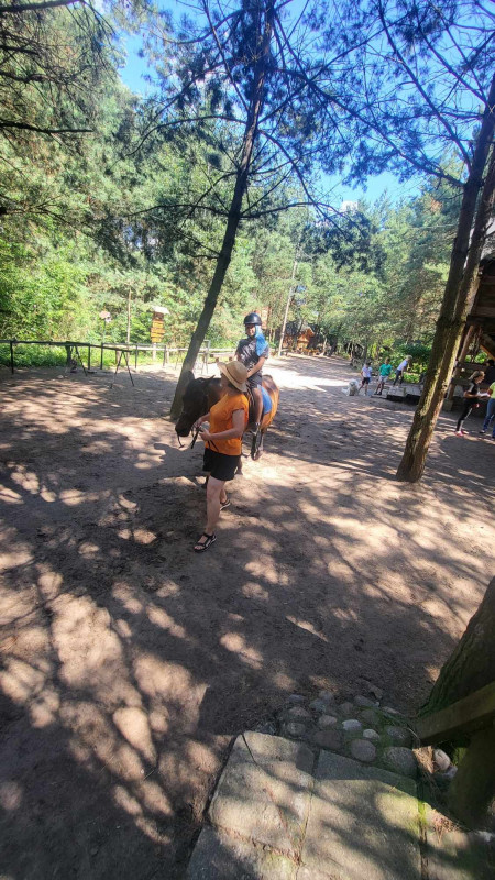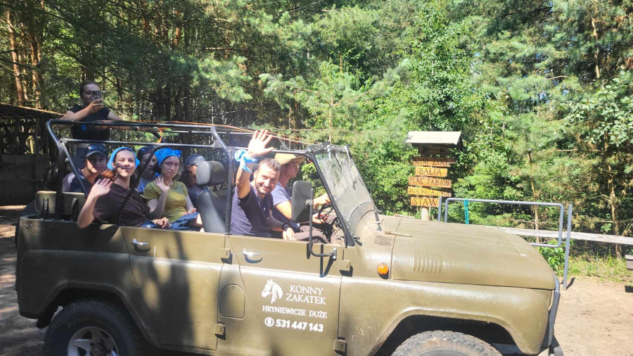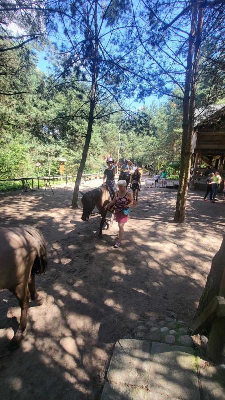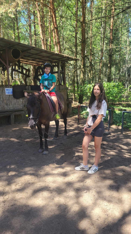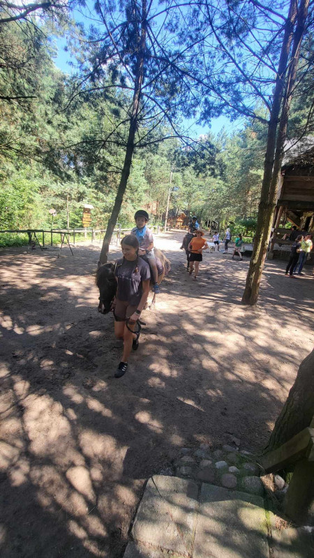 Tu zwiedziliśmy Mini ZOO, gdzie można było pogłaskać niektórych mieszkańców, kolejnym punktem była jazda na koniach, spokojne zwierzęta wiozły nas na spacer po okolicznym pięknym terenie.  Potem była szybsza jazda terenowymi pojazdami a nasz pobyt w Konnym Zakątku zakończyliśmy meczem siatkówki na placu zabaw