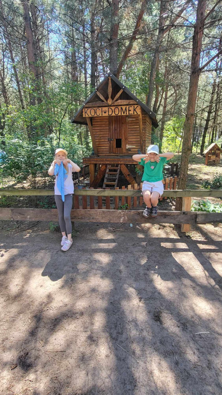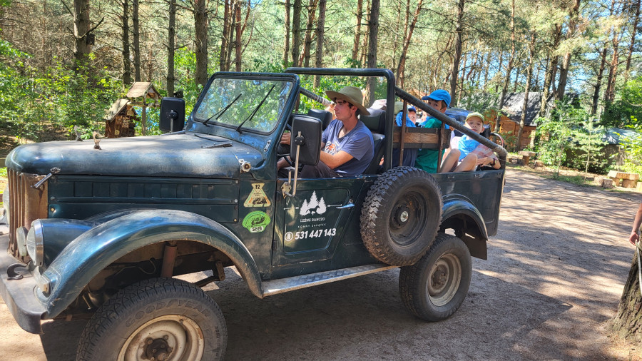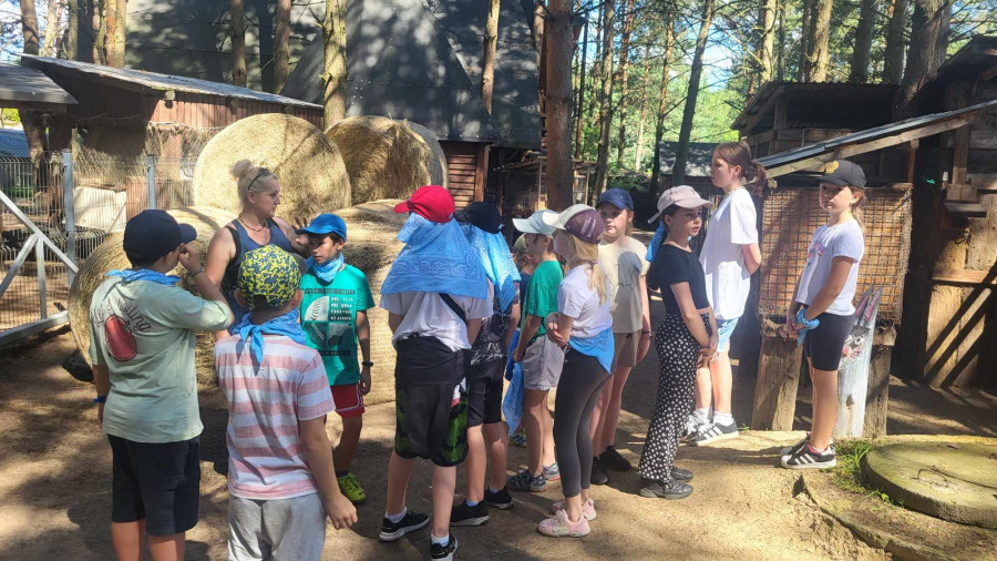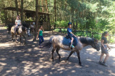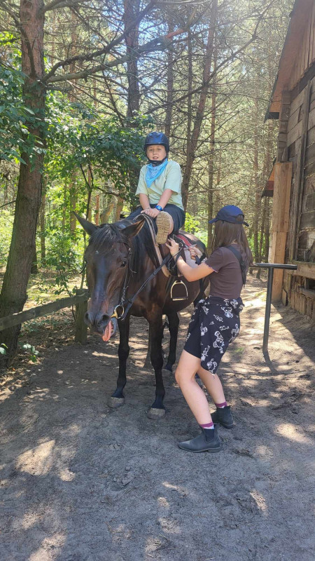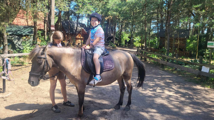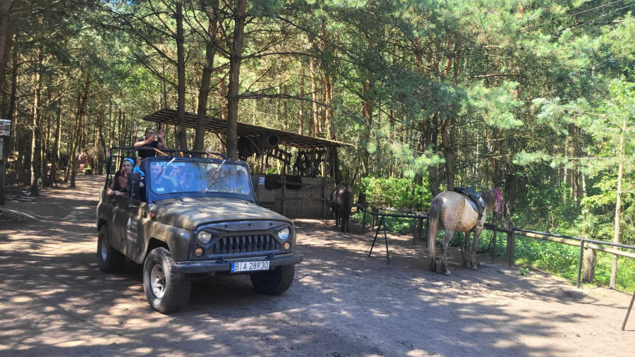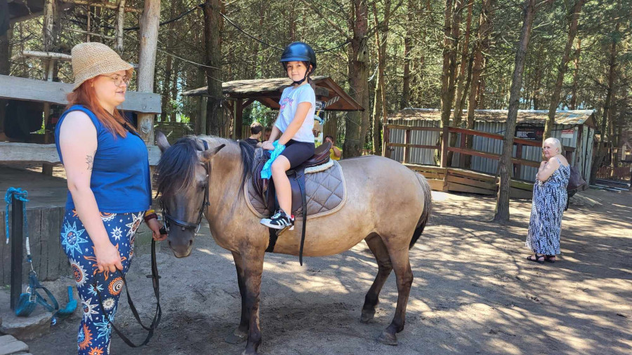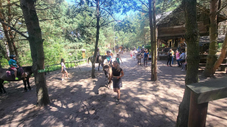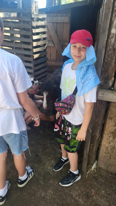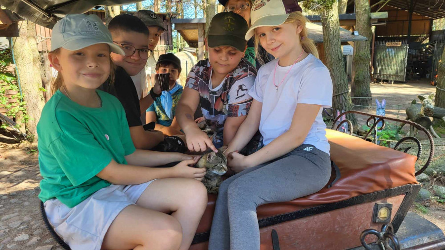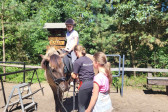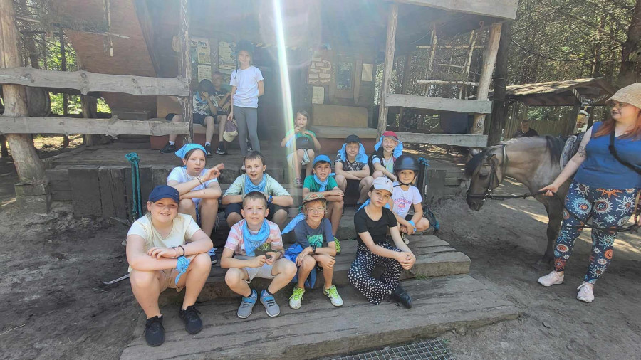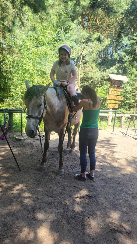 Tu zwiedziliśmy Mini ZOO, gdzie można było pogłaskać niektórych mieszkańców, kolejnym punktem była jazda na koniach, spokojne zwierzęta wiozły nas na spacer po okolicznym pięknym terenie.  Potem była szybsza jazda terenowymi pojazdami a nasz pobyt w Konnym Zakątku zakończyliśmy meczem siatkówki na placu zabaw