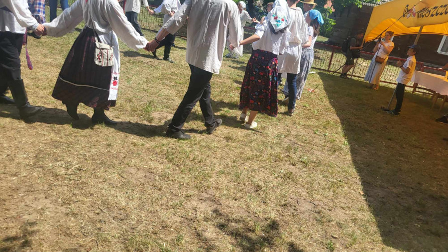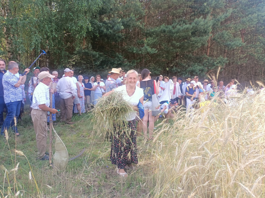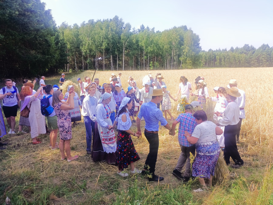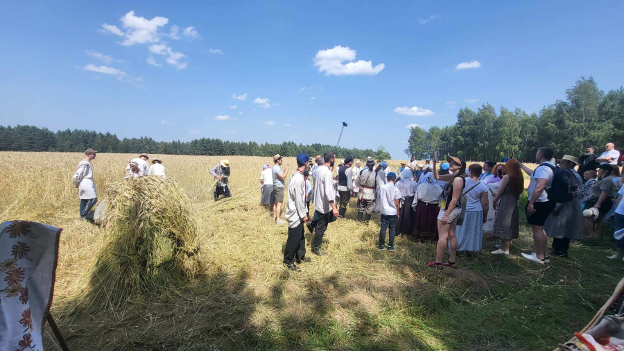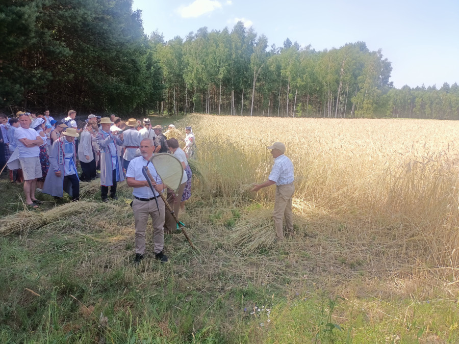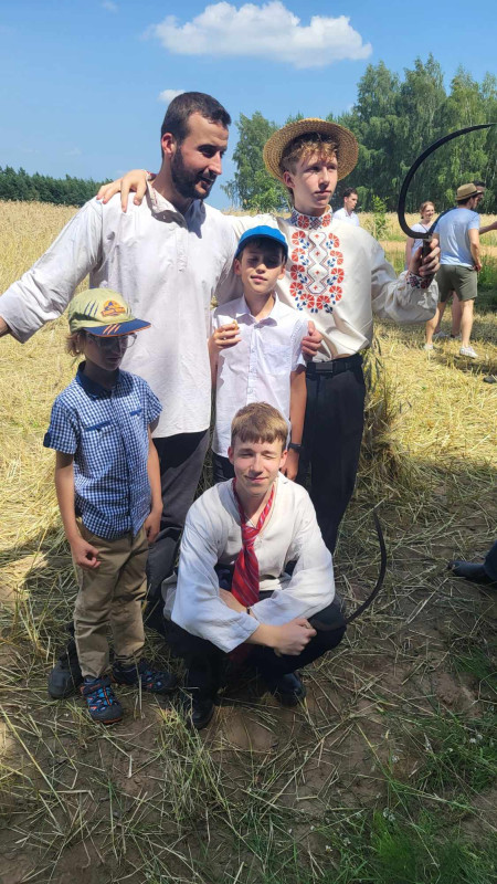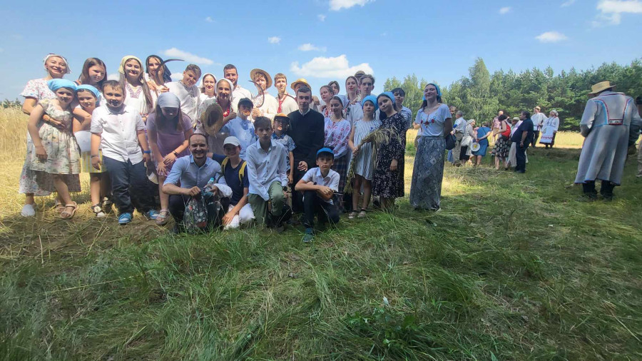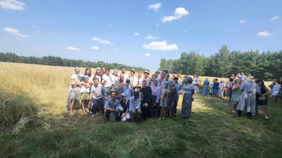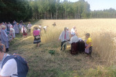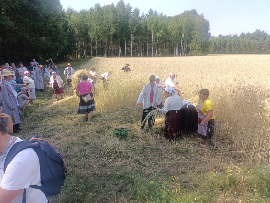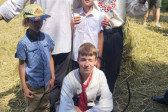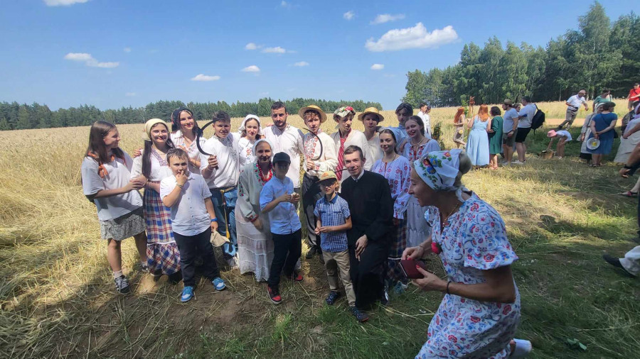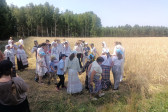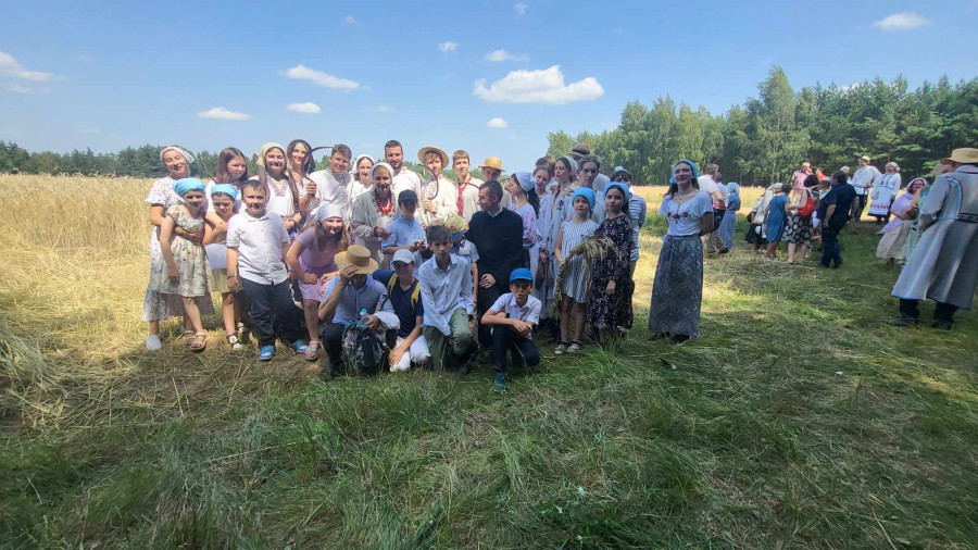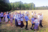 Następnie udaliśmy się do pobliskich Toporek na długo wyczekiwaną Perepelicę. Do tego wydarzenia nasze dzieci i młodzież przygotowywali się przez cały ubiegły tydzień. Na polu, przy pięknych żniwnych pieśniach, żniwiarze kosami kosili żyto a młodzież sierpami. Sceny i śpiewy przeniosły nas wiele lat wstecz kiedy to na polach przy żniwach zawsze rozbrzmiewały piękne pieśni....