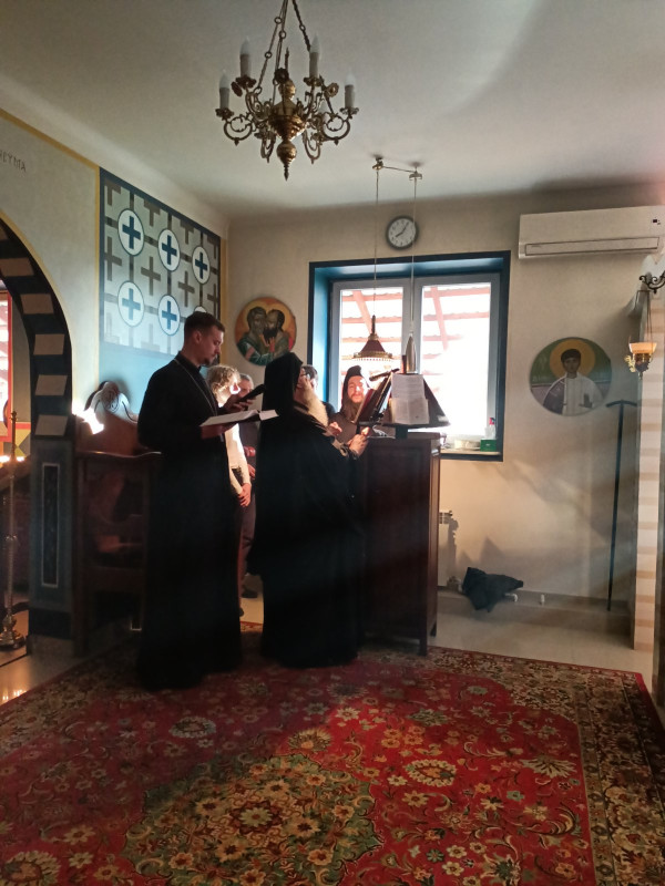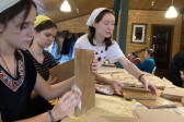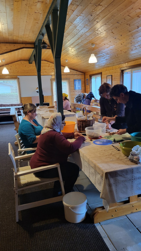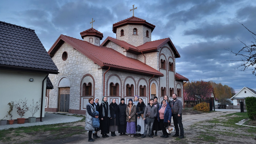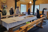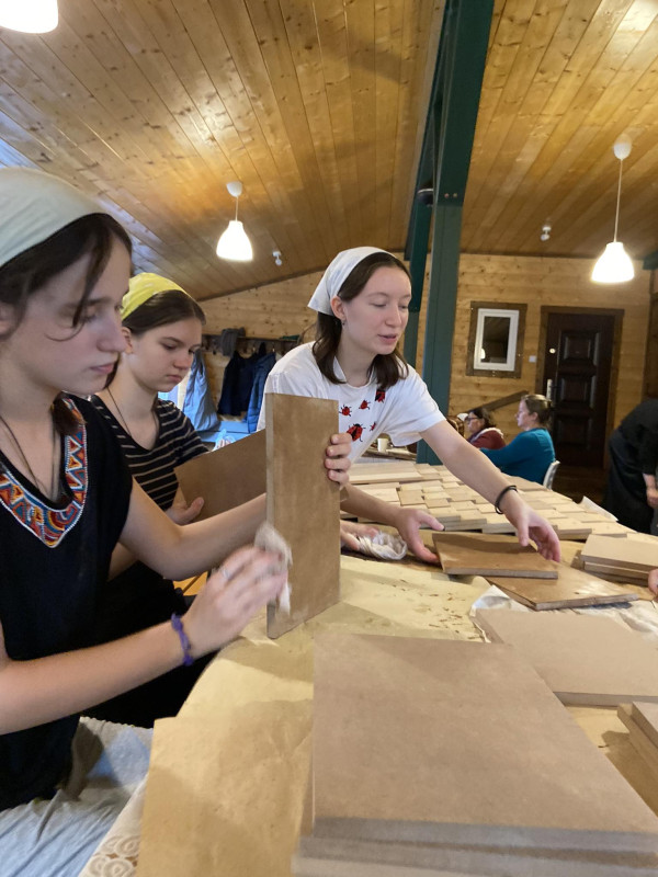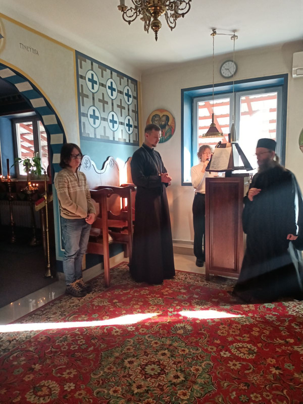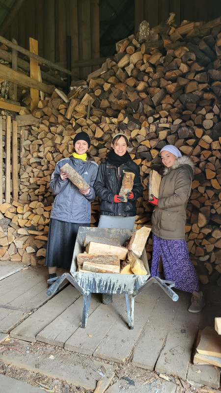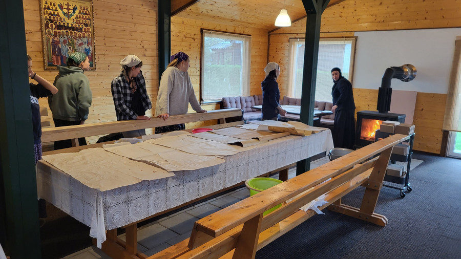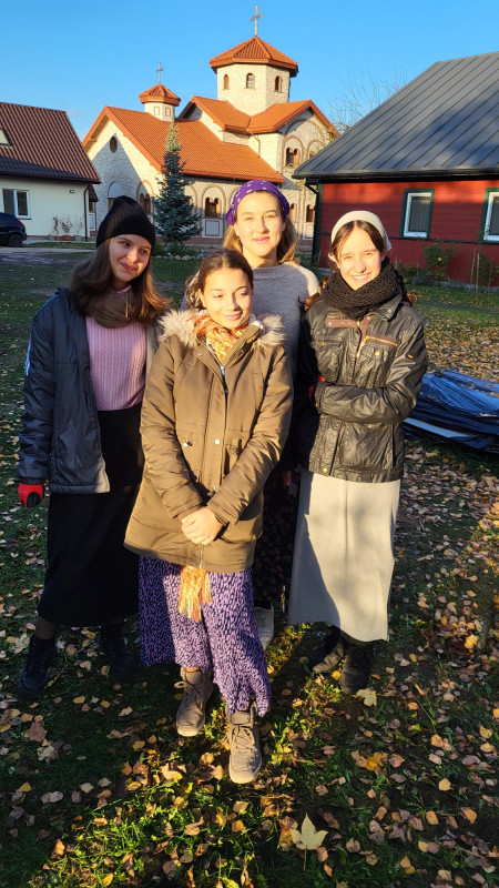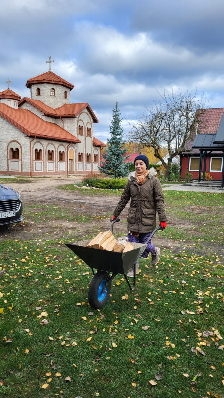 Wraz z biciem monasterskich dzownów opuściłyśmy nasze monasterskie kielie i udaliśmy się do cerkwi na Św. Liturgię. Po nabożeństwie Siostry ugościły nas śniadaniem. Naładowani duchowo i fizycznie ruszyliśmy do posłuszanij. Podzielono nas na grupy, które kolejno zajęły się przecieraniem i czyszczeniem desek na nowe ikony z monasterskiej pracowni. W klasztornej kuchni obierano i czyszczono orzechy oraz pigwę. Natomiast na monasterkim podwórzu szykowano i przewożono drewno na opał. Każdej tej czynności towarzyszyły nam Siostry, którym zadawane były liczne pytania o życie monastyczne. Po pracy czekał na nas pyszny monasterski obiad. Po posiłku mogłyśmy wejść do nowopowstałej cerkwi św. Katarzyny i obejrzeć postępy prac.