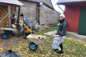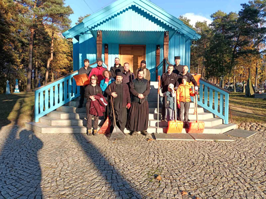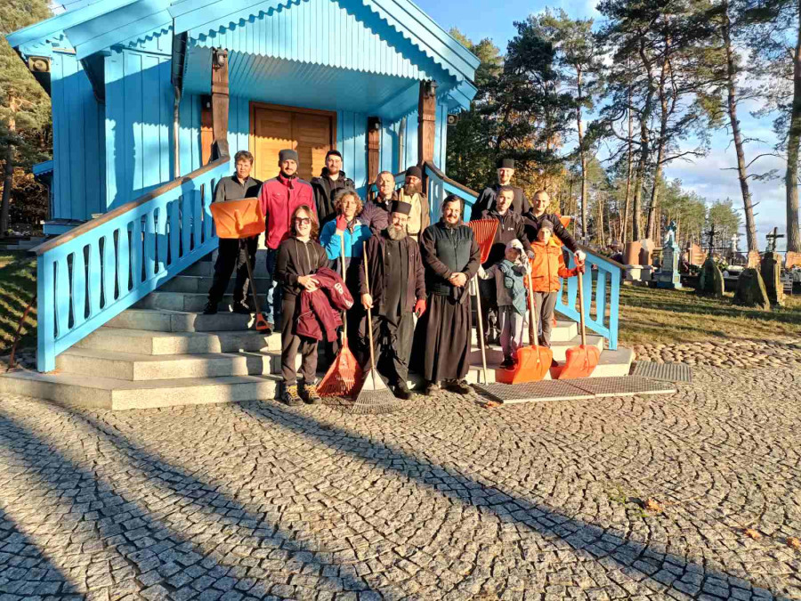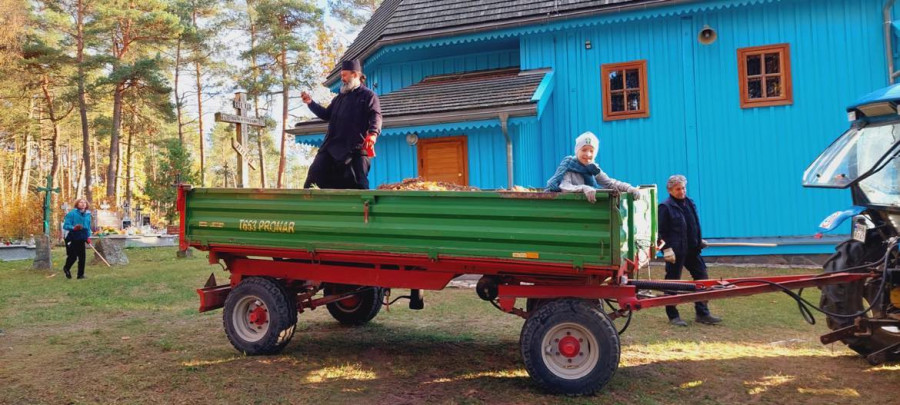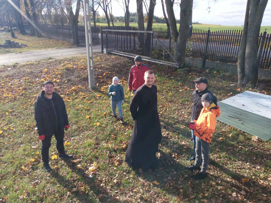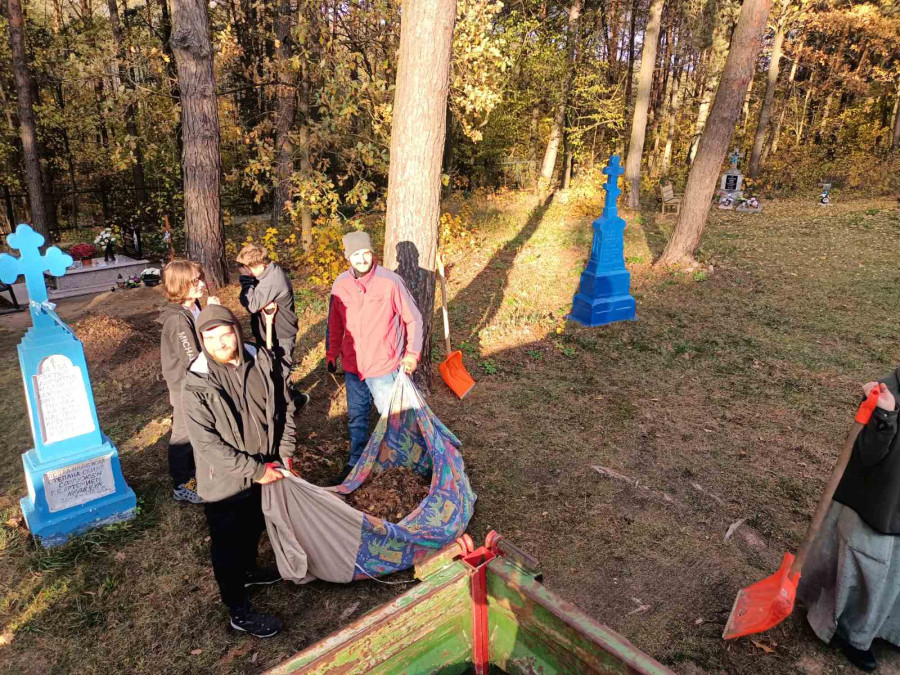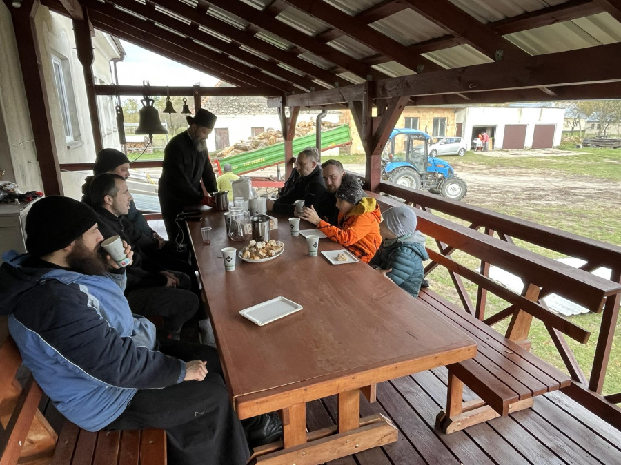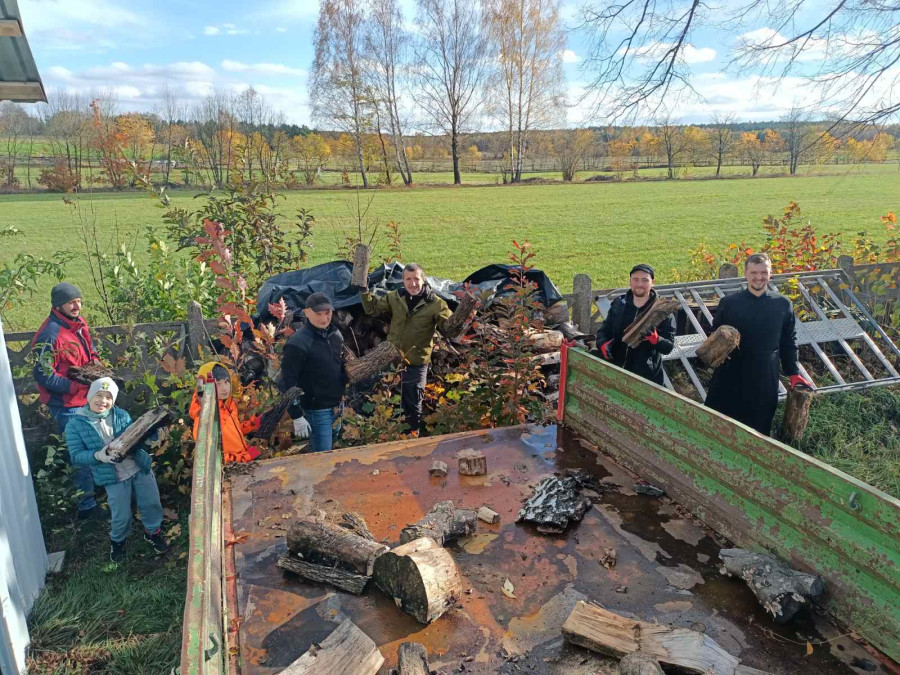 Sobotni słoneczny poranek rozpoczęliśmy od wspólnej modlitwy podczas św. Liturgii w cerkwi św. Nekatariusza. Tego dnia zanoszono szczególne modlitwy za dusze zmarłych, gdyż była to rodzicielska dmitrewskaja subbota. Po nabożeństwie Bracia ugościli nas kawą i herbatą oraz monasterskimi wypiekami i po krótkim odpoczynku w swoich pokojach był to wstęp do obiadu. Naładowani duchowo i fizycznie ruszyliśmy do posłuszanij. Liczną grupę mężczyzn podzielono na 3 zespoły, które kolejno zajęły się sprzątaniem otoczenia cerkwi św. Dymitra, podwórza monasterskiego oraz przewozem opału do monasterskiej kotłowni. Każdej grupie dowodził jeden z Ojców klasztoru, dzięki czemu mogliśmy rozmawiać o życiu monastycznym, jak i o przyziemnych potrzebach i planach Braci klasztoru. Dla niektórych młodych ludzi był to pierwszy kontakt z prawosławnym monastycyzmem. Po posłuszaniju przed samym wyjazdem Ojcowie ugościli nas swoimi tradycyjnymi wyrobami, czyli serami monasterskimi.