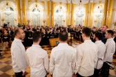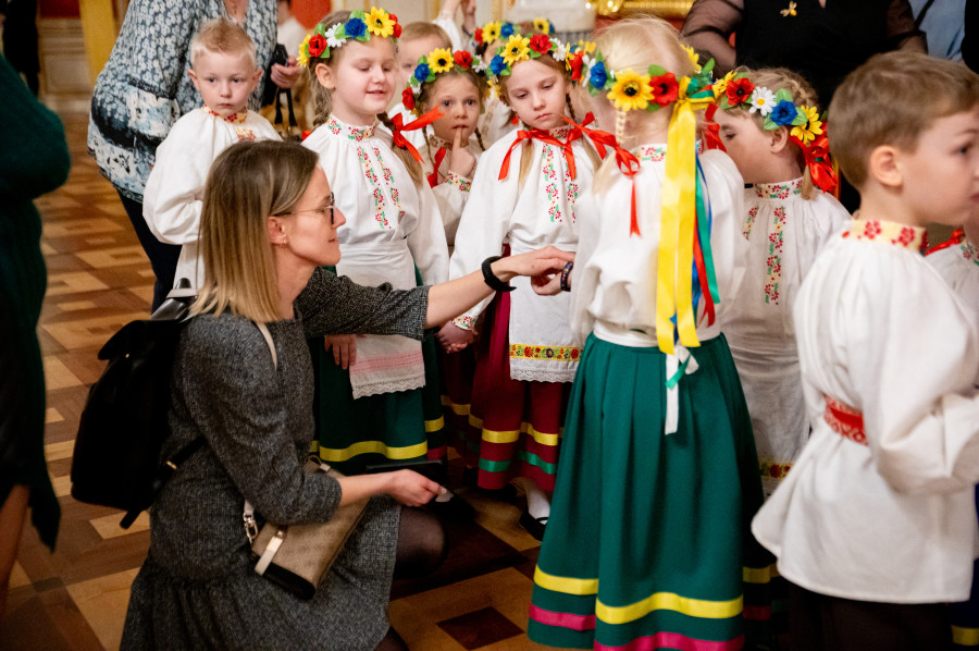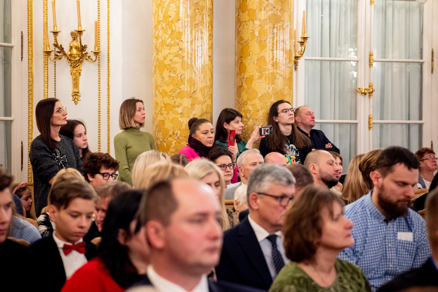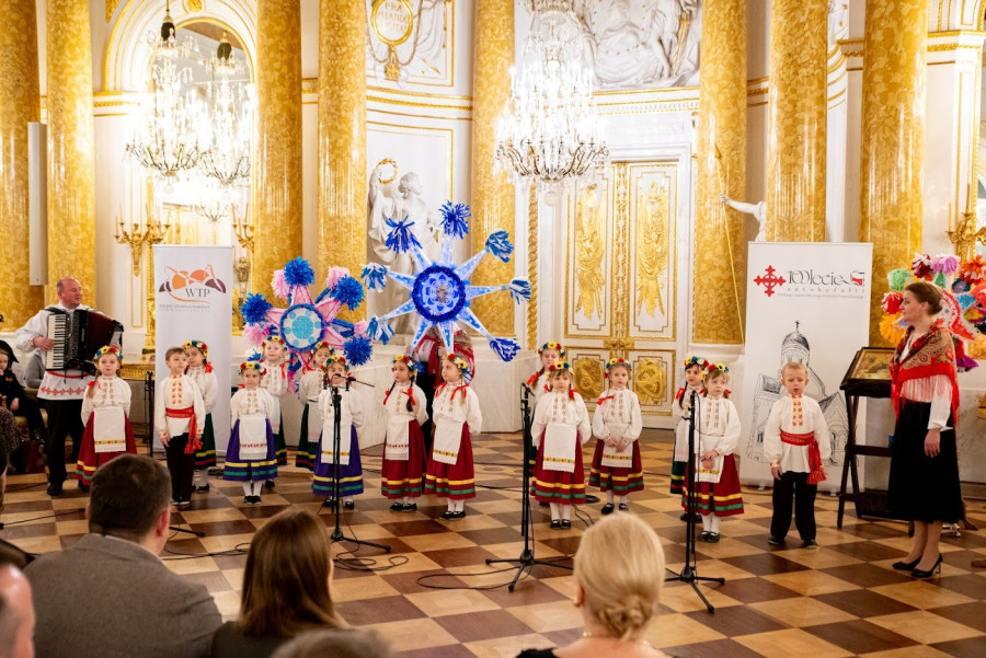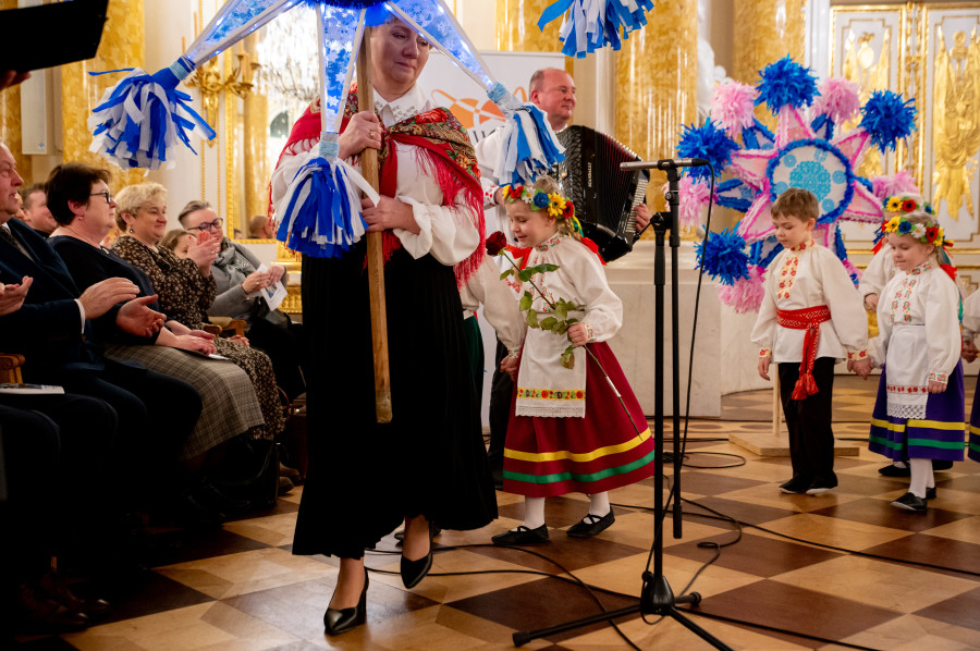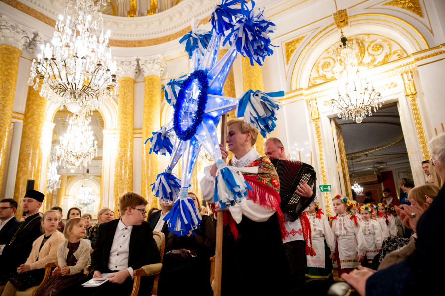 Słowa pieśni, którą wędrujący od chaty do chaty kolędnicy już wieki temu witali kolejnych mieszkańców wsi chcących posłuchać kolęd i współdzielić z całą społecznością radość świąt Bożego Narodzenia zabrzmiały teraz w najbardziej reprezentacyjnej sali zamkowej, wśród złoconych stiuków, kolumn i kryształowych żyrandoli.