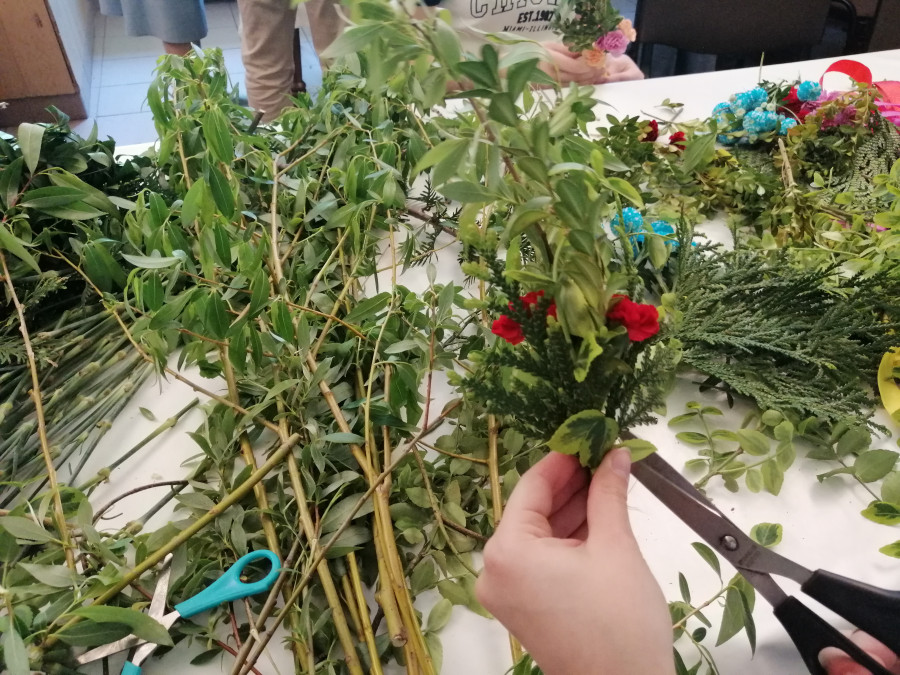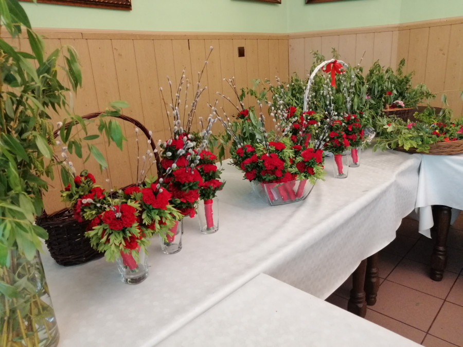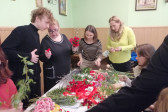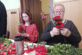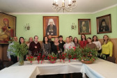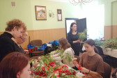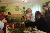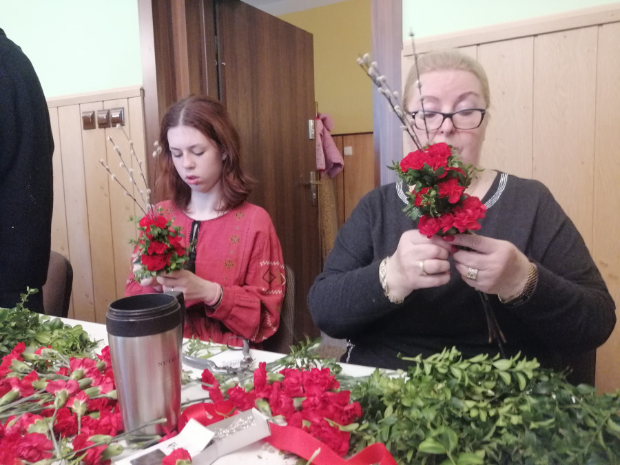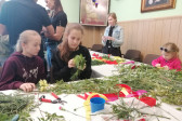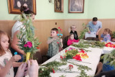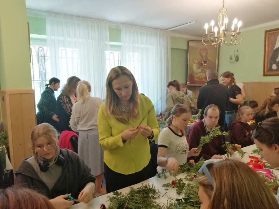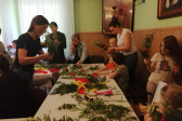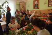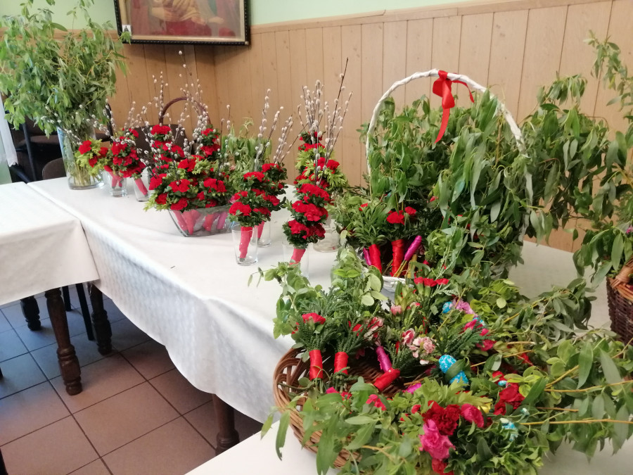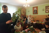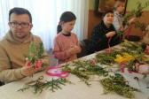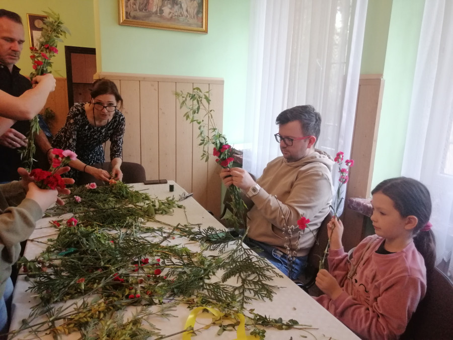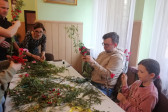 Rodziny z dziećmi, starsi i młodsi oraz wszyscy chętni, przybyli do świetlicy parafialnej, gdzie czekały wszystkie niezbędne materiały - gałązki wierzby, bukszpan, rozmaite goździki, wiele ciekawych roślin ozdobnych i kolorowe wstążki. Pani Irena Sacharczuk szczegółowo omówiła i pokazała każdy krok wykonania takiej palemki.