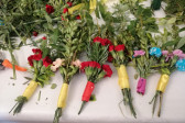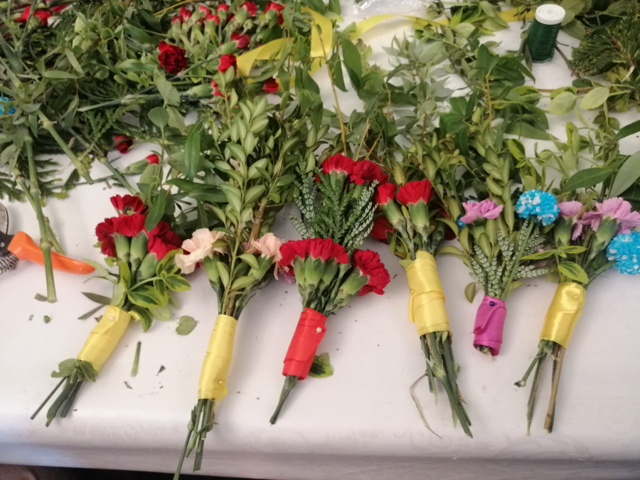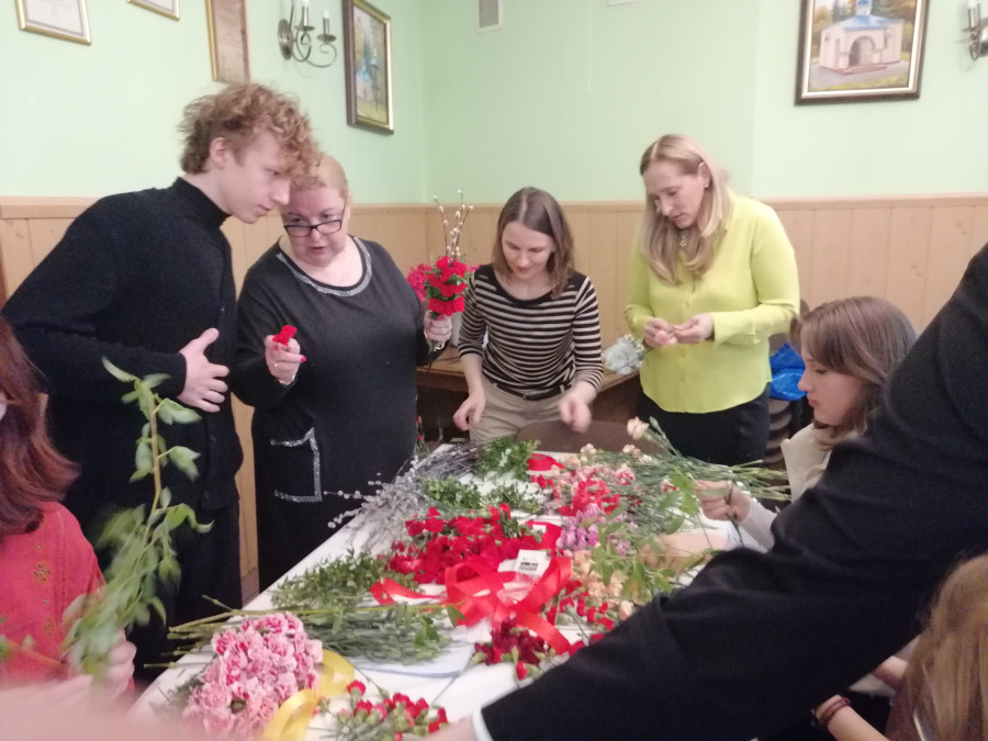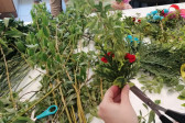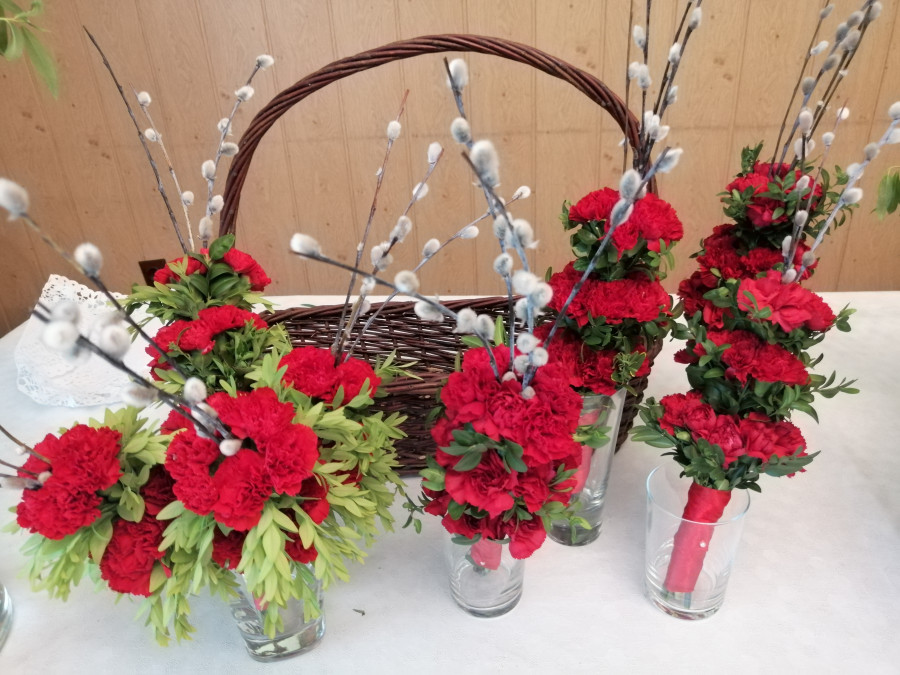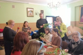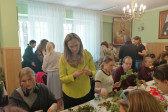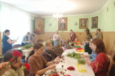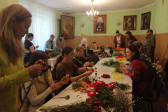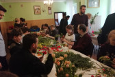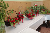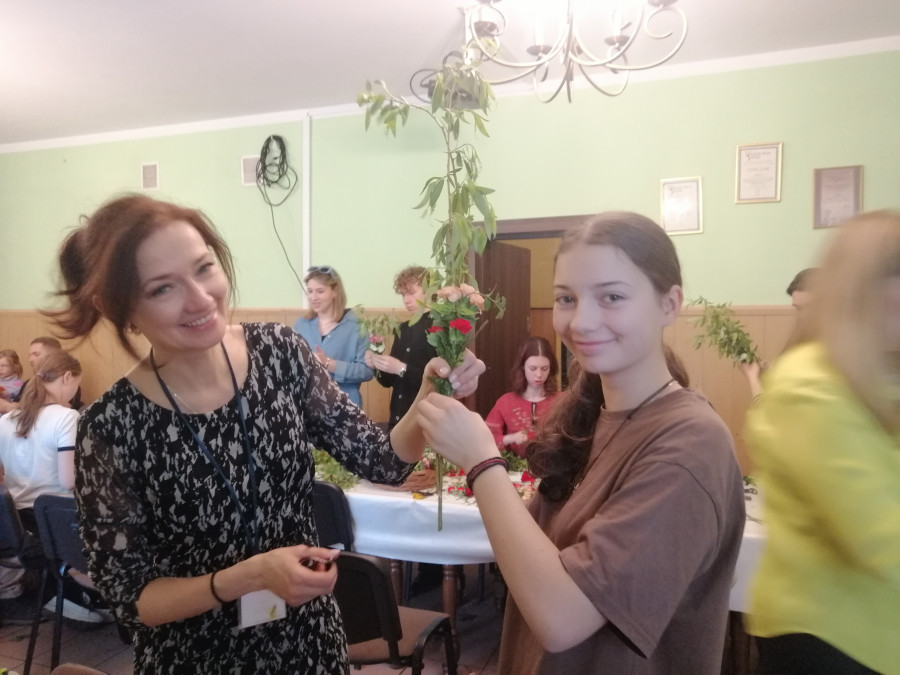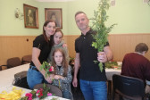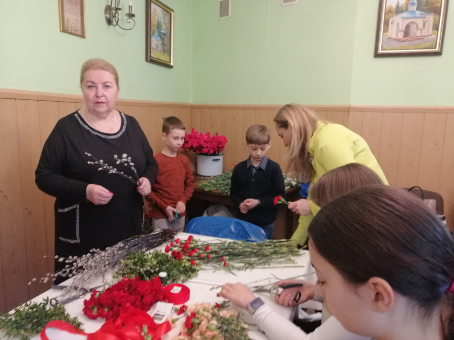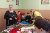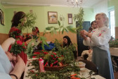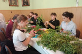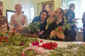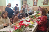 Rodziny z dziećmi, starsi i młodsi oraz wszyscy chętni, przybyli do świetlicy parafialnej, gdzie czekały wszystkie niezbędne materiały - gałązki wierzby, bukszpan, rozmaite goździki, wiele ciekawych roślin ozdobnych i kolorowe wstążki. Pani Irena Sacharczuk szczegółowo omówiła i pokazała każdy krok wykonania takiej palemki.