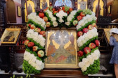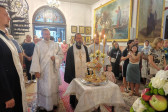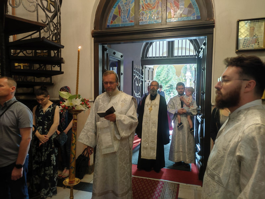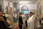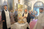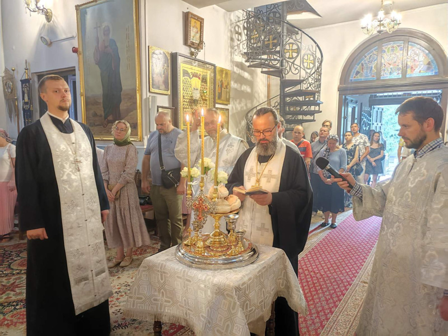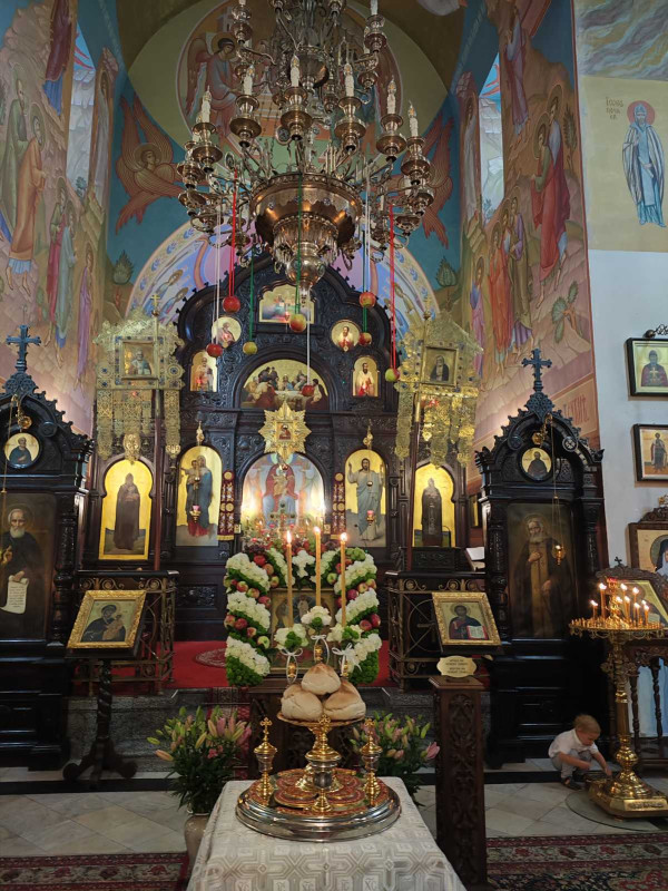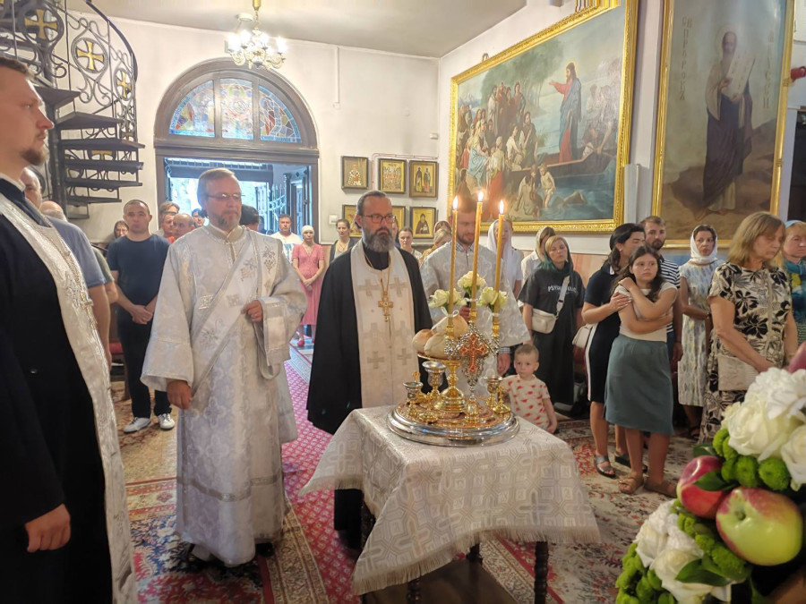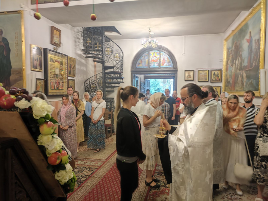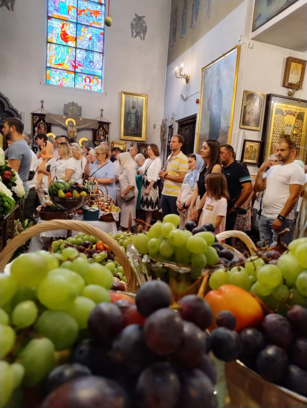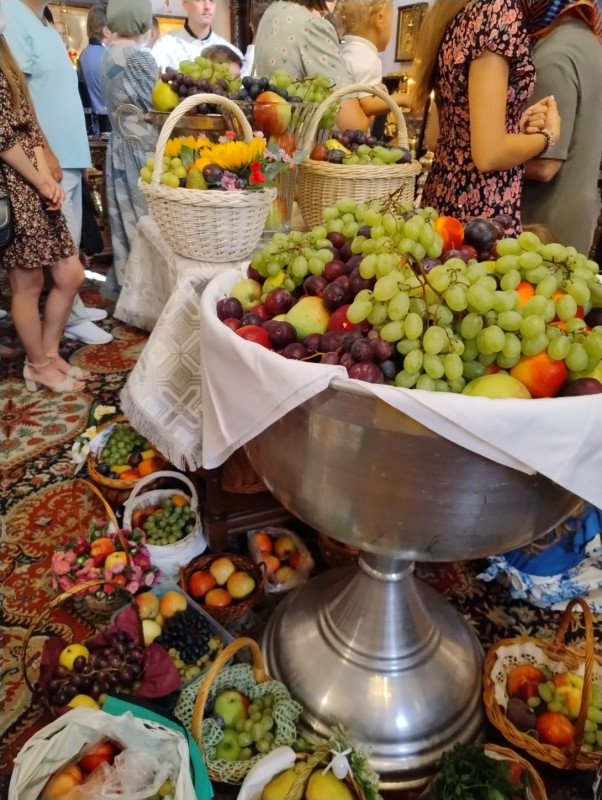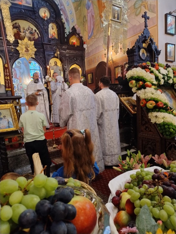 W naszej parafii radość święta rozpoczęła się od całonocnego czuwania w piątek (18.08.2024 r.) o godz. 17.00. Następnego dnia w świąteczny poranek odbyła się Boska Liturgia o godz. 9.00. Po służbie duchodni wyszli na środek świątyni i święcili owoce. Czyni się to nie tylko dlatego, że w tym czasie dojrzewają owoce, ale też dlatego, iż tu właśnie znajduje się związek z odrodzeniem stworzenia. Przypominają one zniszczone rajskie szczęście, a z drugiej strony – pocieszają nas obietnicą, że i w przyszłym życiu będzie nieopisana rajska słodycz.