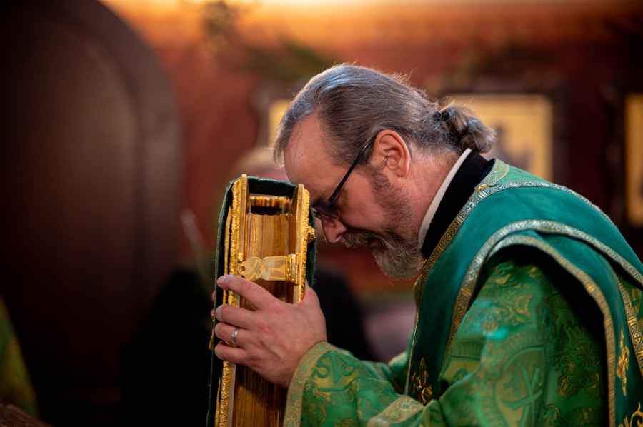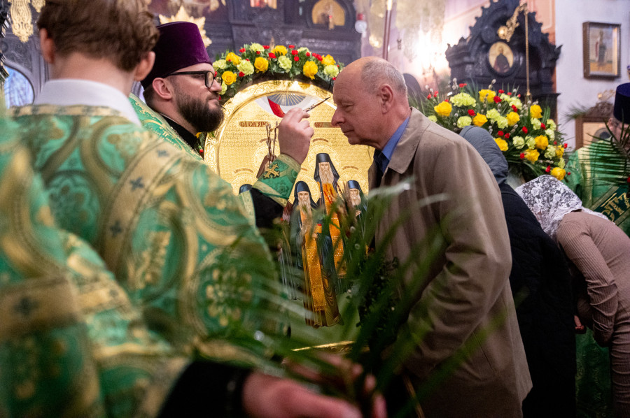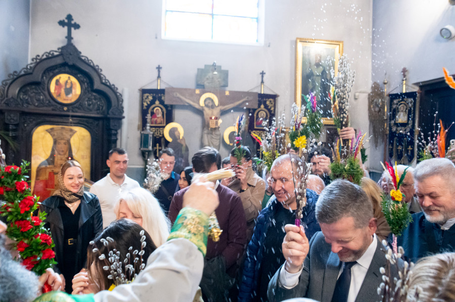 W naszej parafii rozpoczęliśmy obchody święta od całonocnego czuwania w sobotę (12.04.2025 r.) o godz. 17.00. Kilkanaście minut przed rozpoczęciem służby duchowni przenieśli w uroczystej procesji z domu parafialnego do cerkwi nową ikonę współczesnych atoskich świętych (więcej tutaj). Na jutrzni, podczas polijeleja, zostały poświęcone palmy, co jest znakiem rozpoznawczym tego święta oraz naszym przywitaniem Króla królów, który niebawem wkroczy do niebiańskiego Jeruzalem.