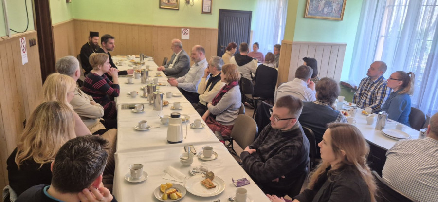 W niedzielę, 29.03.2026 r., po drugiej i trzeciej Boskiej Liturgii, w domu parafialnym odbyły się spotkania z ih. Porfiriuszem (Orzechowskim) z Monasteru św. Dymitra Sołuńskiego w Sakach. Na pierwszy wykład przyszli rodzice z naszego Punktu Katechetycznego, zaś na drugi wszyscy zainteresowani wierni. O. Porfiriusz przedstawił teoretyczne i praktyczne aspekty Wielkiego Postu, czemu mamy pościć, jakie są owoce postu, jakie postawy powinniśmy przyjmować w tym okresie, jak ubogacić swoje życie modlitewne, jaką w tym rolę może odgrywać Akatyst do Zwiastowania Przenajświętszej Bogurodzicy, Liturgia Uprzednio Poświęconych Darów oraz Modlitwa Jezusowa. Na koniec nastąpił ważny moment, gdy o. Porfiriusz odmówił 3 razy głośno Modlitwę Jezusową oraz przekazując czotki, poprosił, aby każdy z zebranych także powiedział modlitwę.