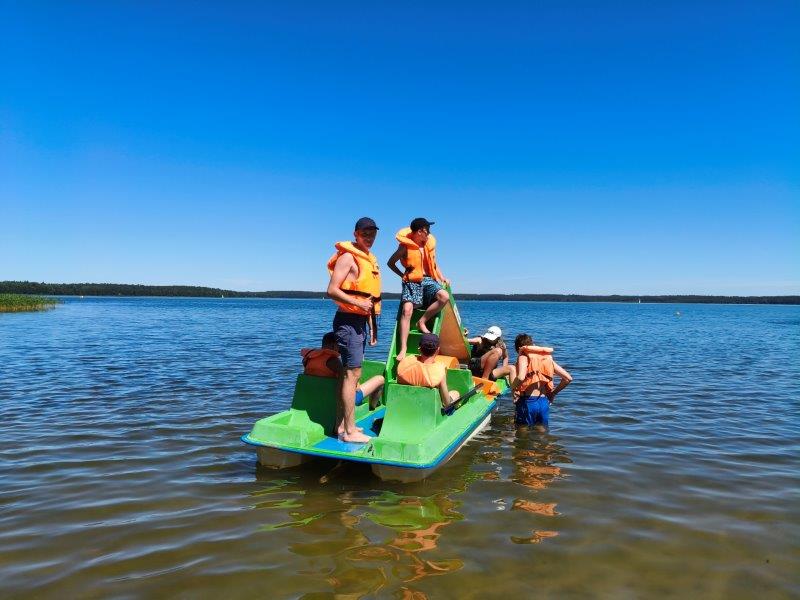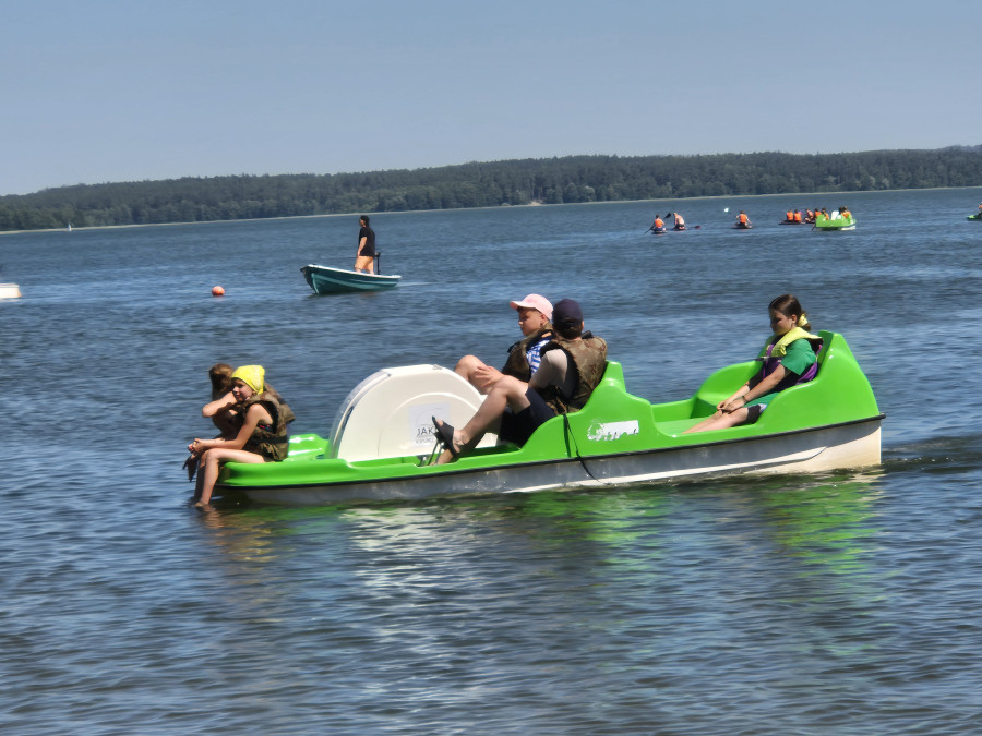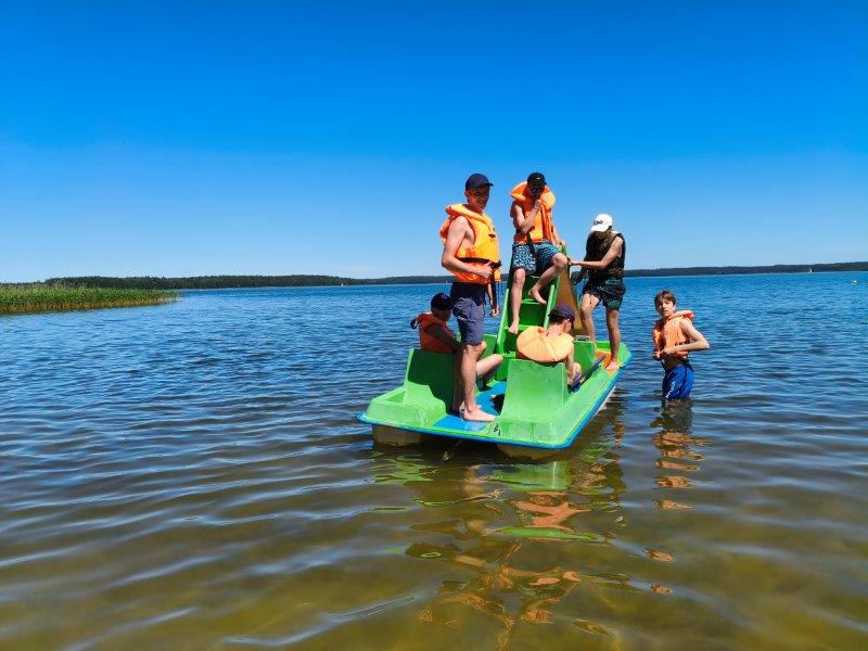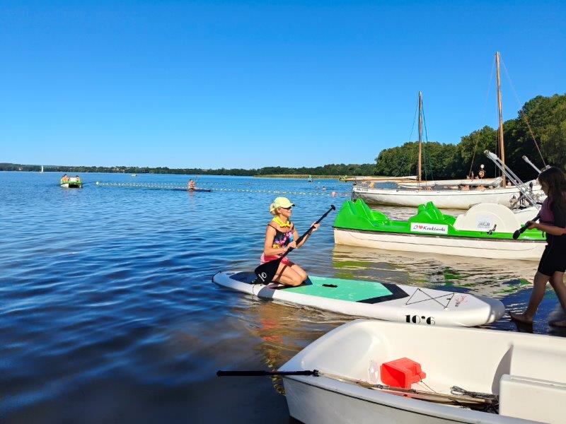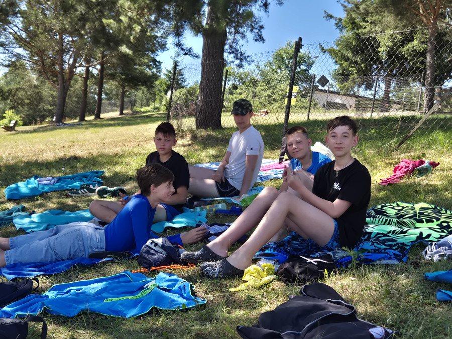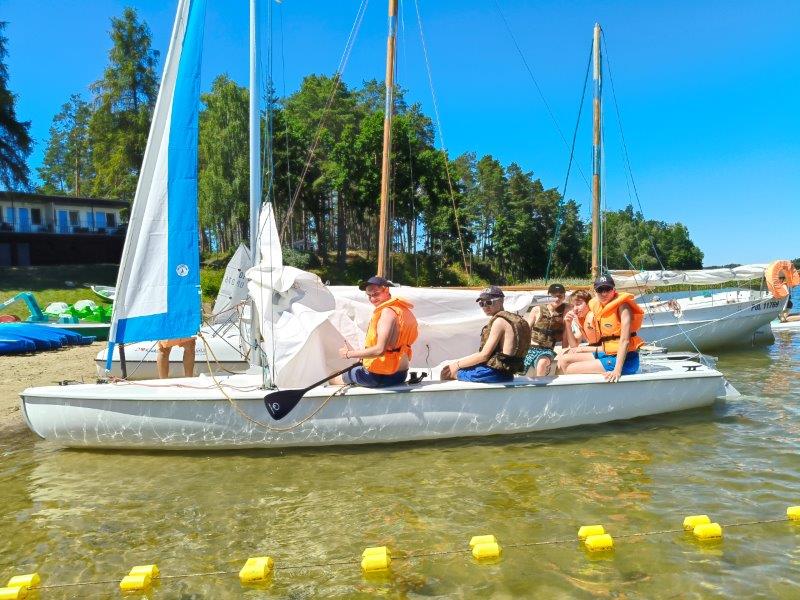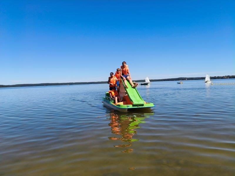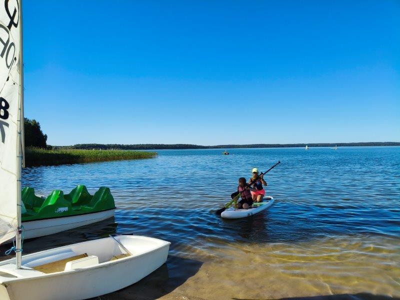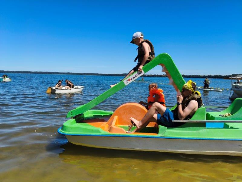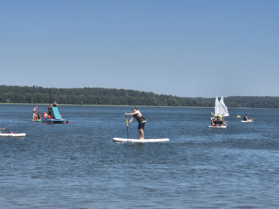 Piękna słoneczna pogoda umożliwiła nam skorzystanie z wszystkich atrakcji. Wszycy rozpoczęliśmy od kąpieli w jeziorze. Ogromną popularnością cieszyły się rowery wodne szczególnie te ze zjeżdżalnią i deski SUP. Następna grupa pogłębiała umiejętności pływania na łódkach typu "Optymist" z żaglem i na łódce typu "Omega" pod okiem naszego instruktora Jakuba i p. Tomka. W przerwach były gry w piłkę nożną, siatkową, koszykową.