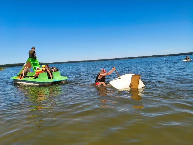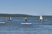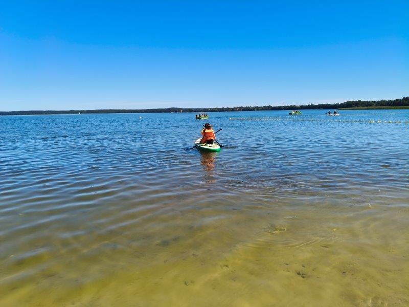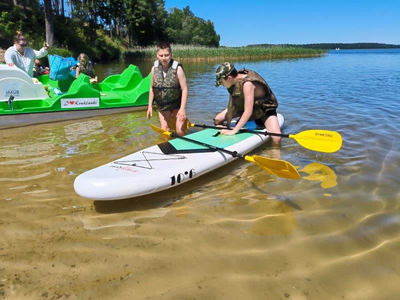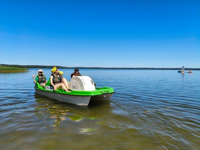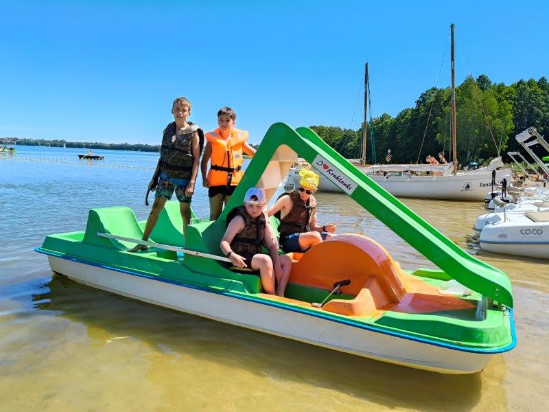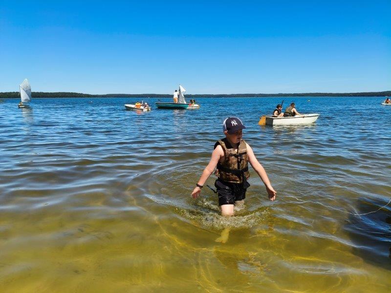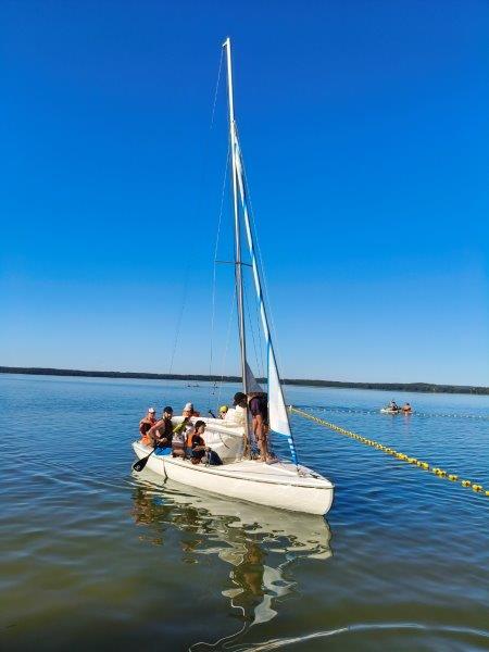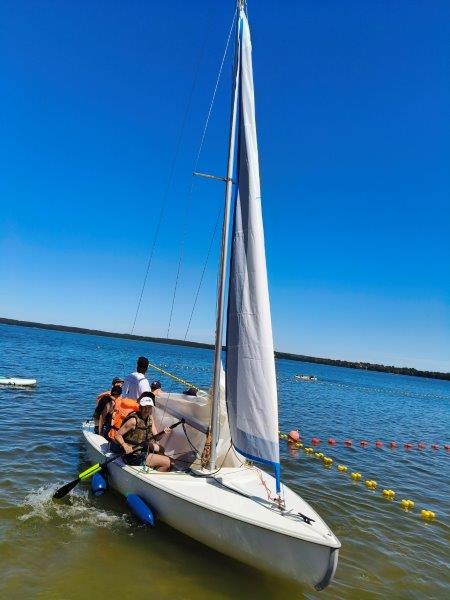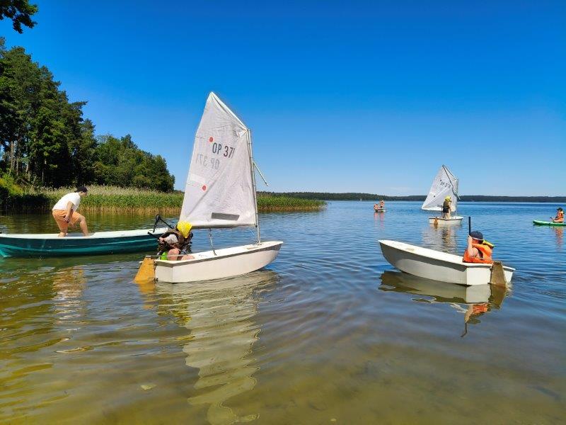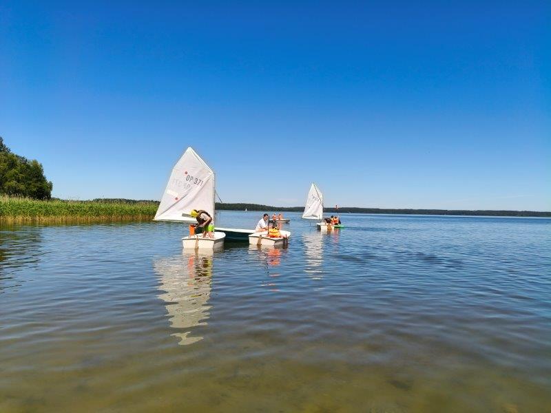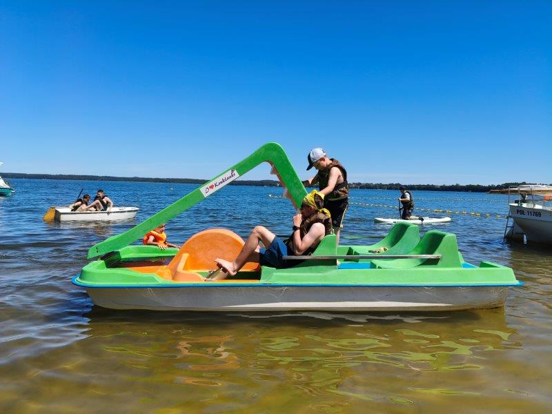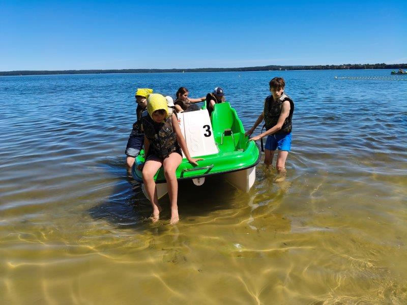 Piękna słoneczna pogoda umożliwiła nam skorzystanie z wszystkich atrakcji. Wszycy rozpoczęliśmy od kąpieli w jeziorze. Ogromną popularnością cieszyły się rowery wodne szczególnie te ze zjeżdżalnią i deski SUP. Następna grupa pogłębiała umiejętności pływania na łódkach typu "Optymist" z żaglem i na łódce typu "Omega" pod okiem naszego instruktora Jakuba i p. Tomka. W przerwach były gry w piłkę nożną, siatkową, koszykową.