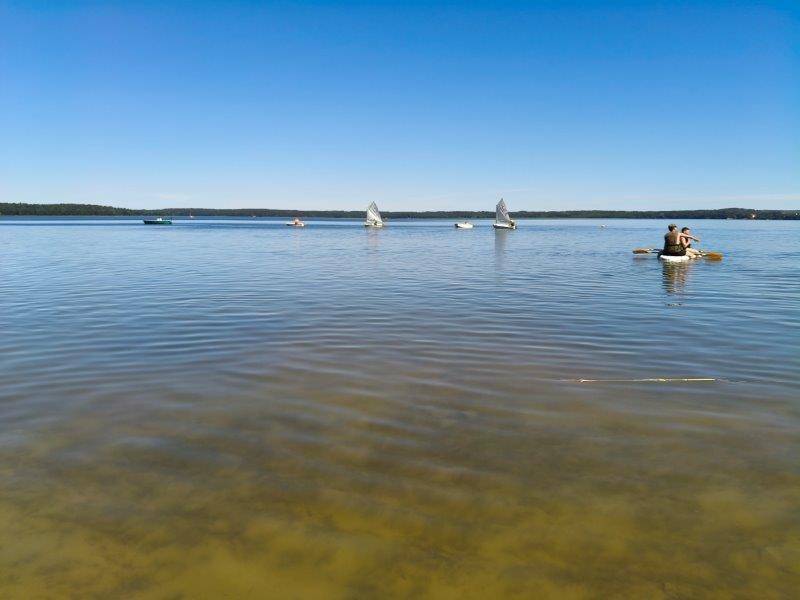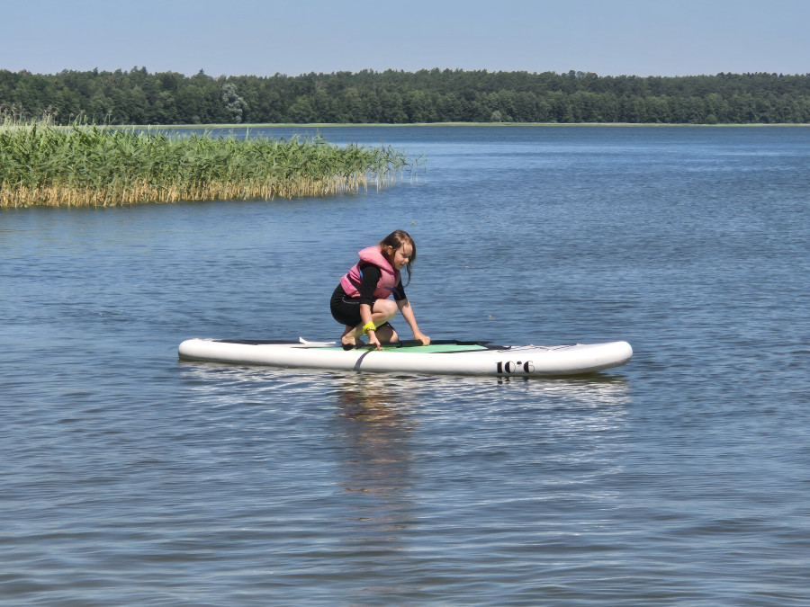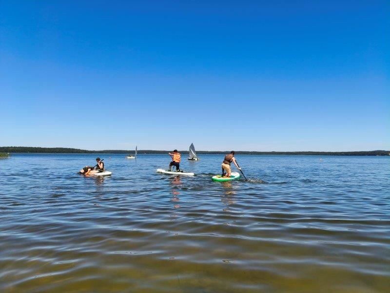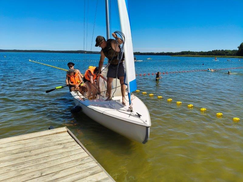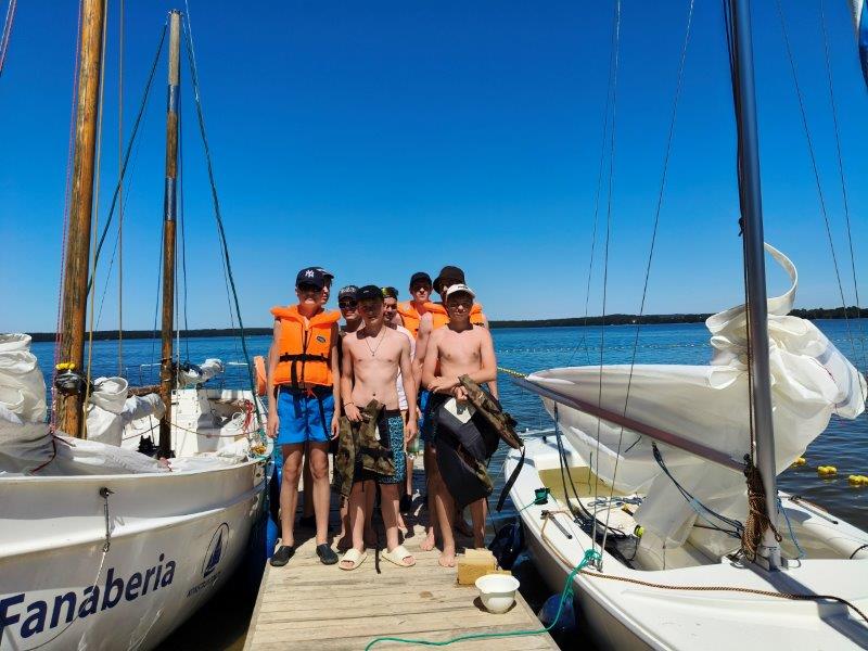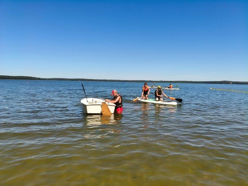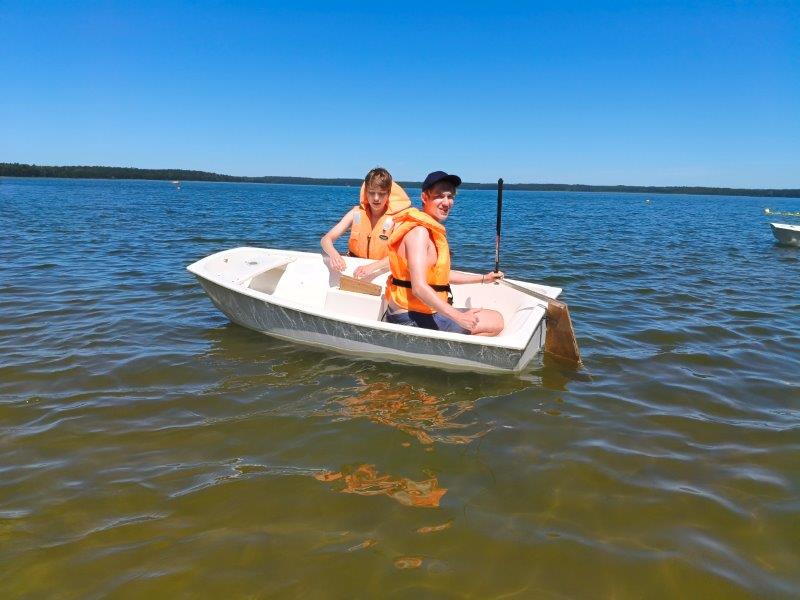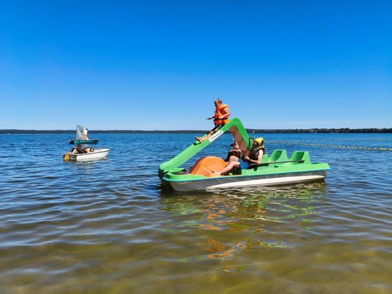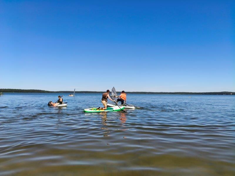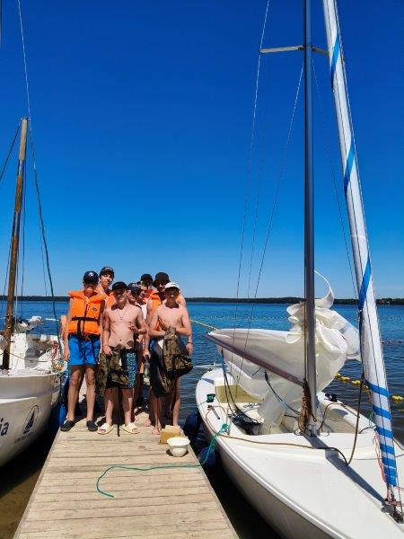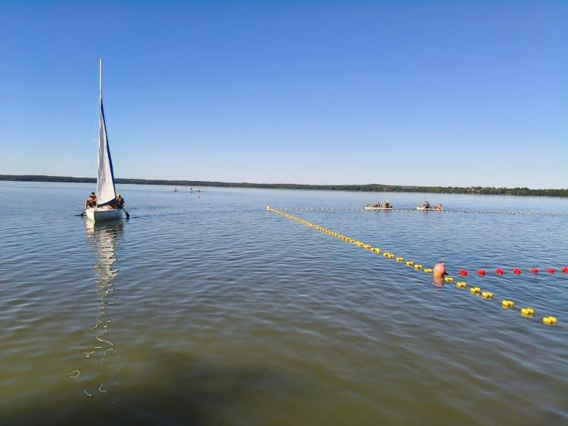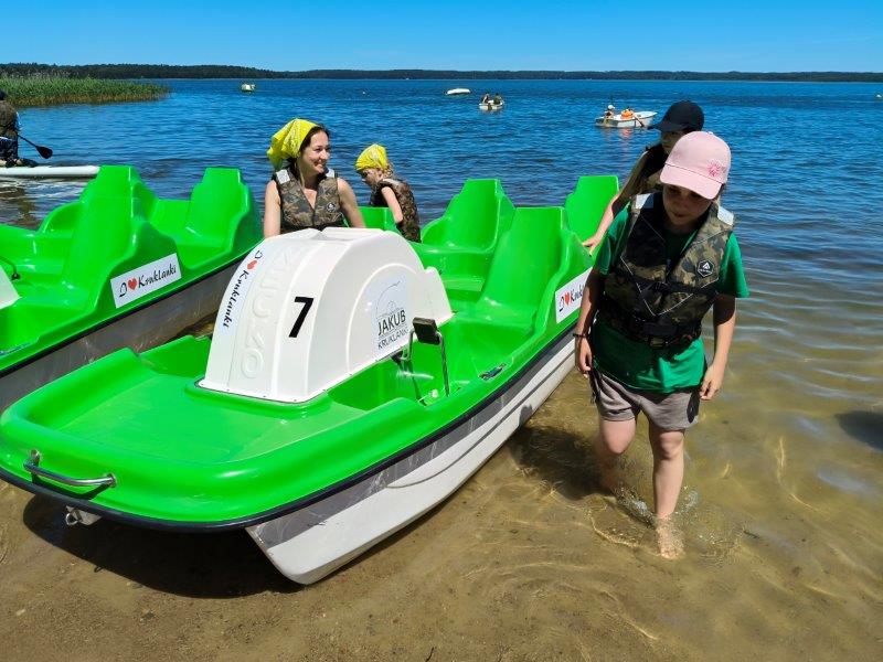 Piękna słoneczna pogoda umożliwiła nam skorzystanie z wszystkich atrakcji. Wszycy rozpoczęliśmy od kąpieli w jeziorze. Ogromną popularnością cieszyły się rowery wodne szczególnie te ze zjeżdżalnią i deski SUP. Następna grupa pogłębiała umiejętności pływania na łódkach typu "Optymist" z żaglem i na łódce typu "Omega" pod okiem naszego instruktora Jakuba i p. Tomka. W przerwach były gry w piłkę nożną, siatkową, koszykową.