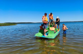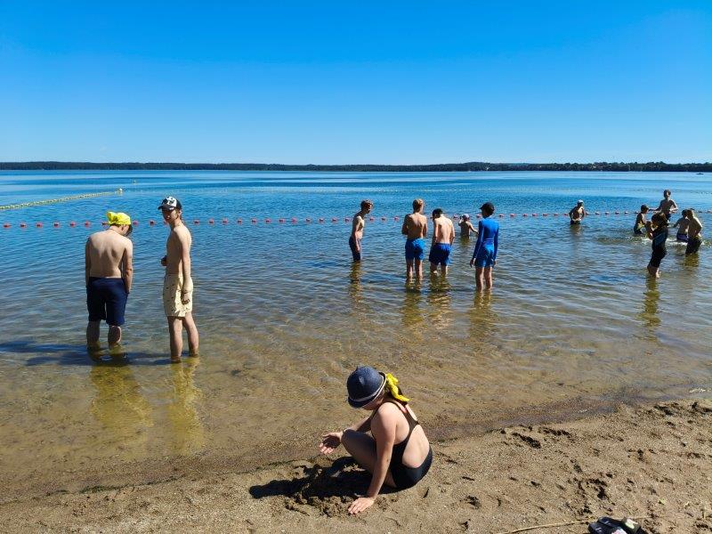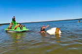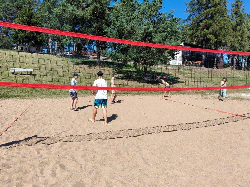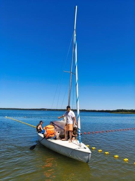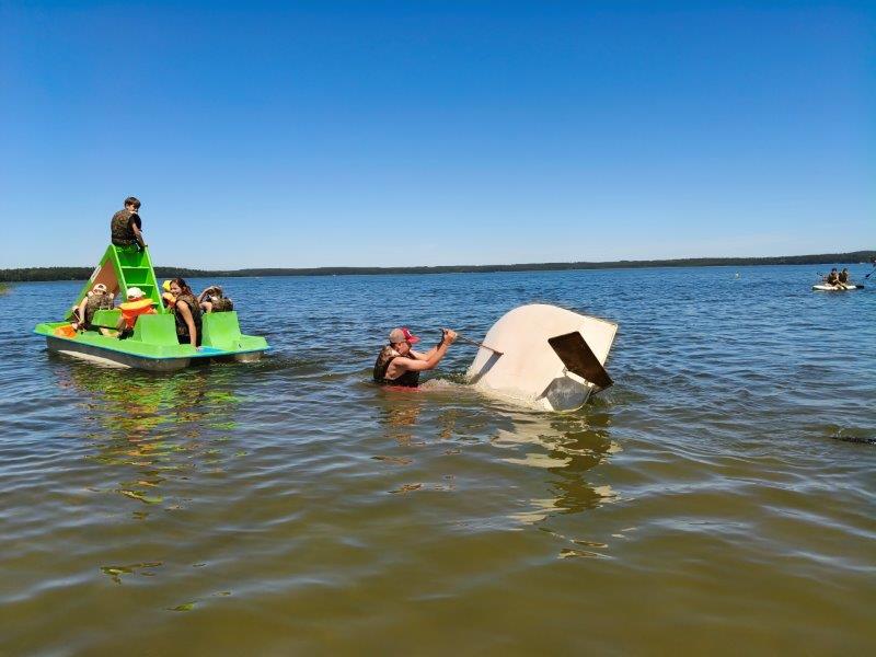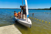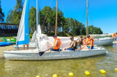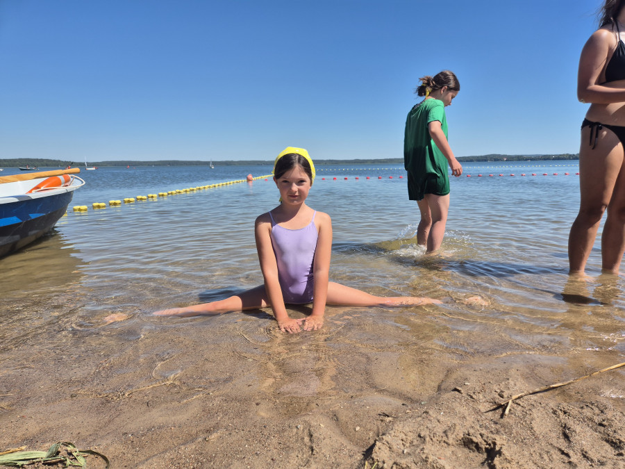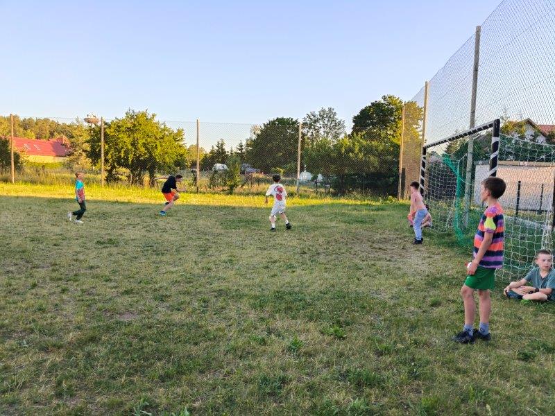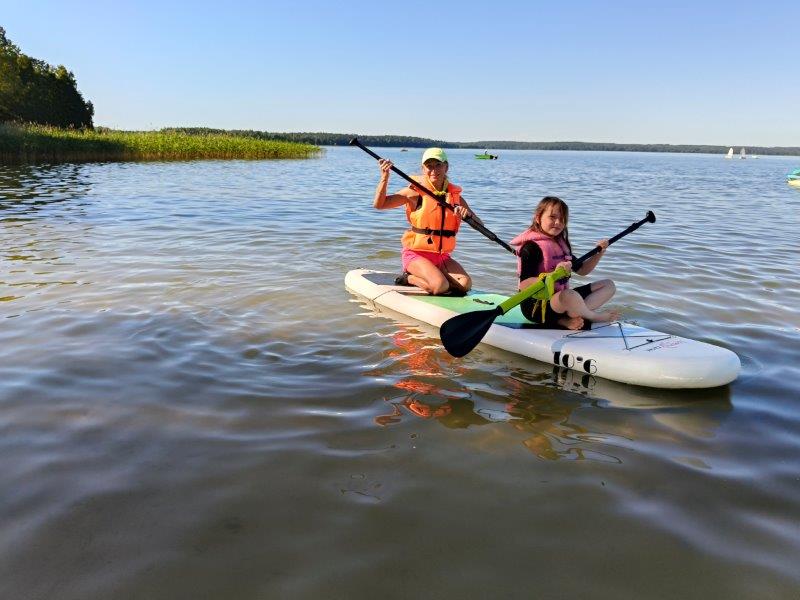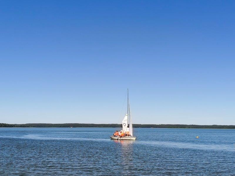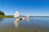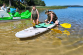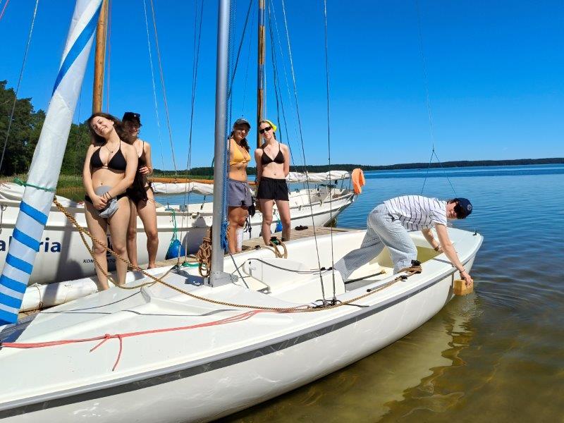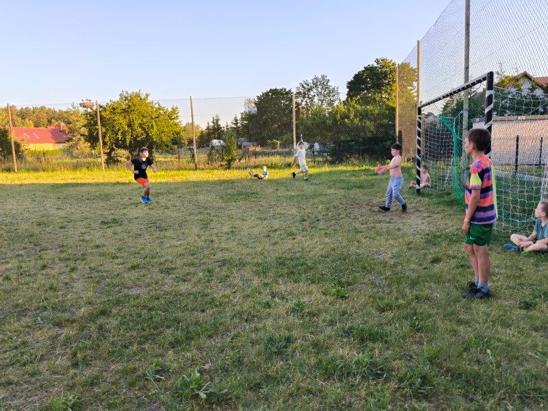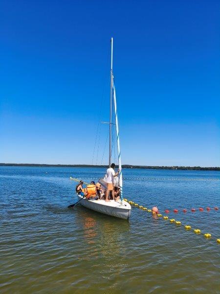 Piękna słoneczna pogoda umożliwiła nam skorzystanie z wszystkich atrakcji. Wszycy rozpoczęliśmy od kąpieli w jeziorze. Ogromną popularnością cieszyły się rowery wodne szczególnie te ze zjeżdżalnią i deski SUP. Następna grupa pogłębiała umiejętności pływania na łódkach typu "Optymist" z żaglem i na łódce typu "Omega" pod okiem naszego instruktora Jakuba i p. Tomka. W przerwach były gry w piłkę nożną, siatkową, koszykową.