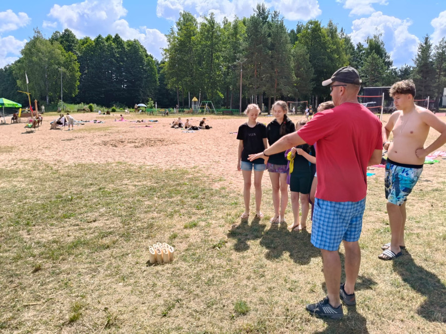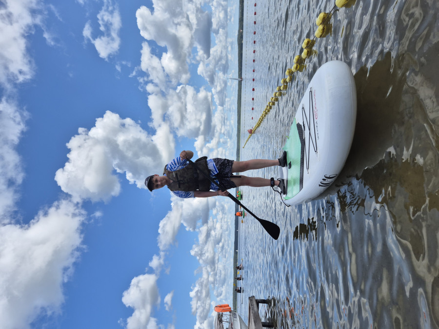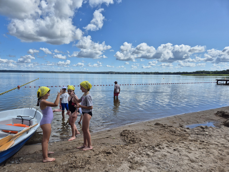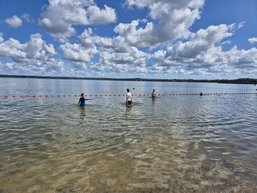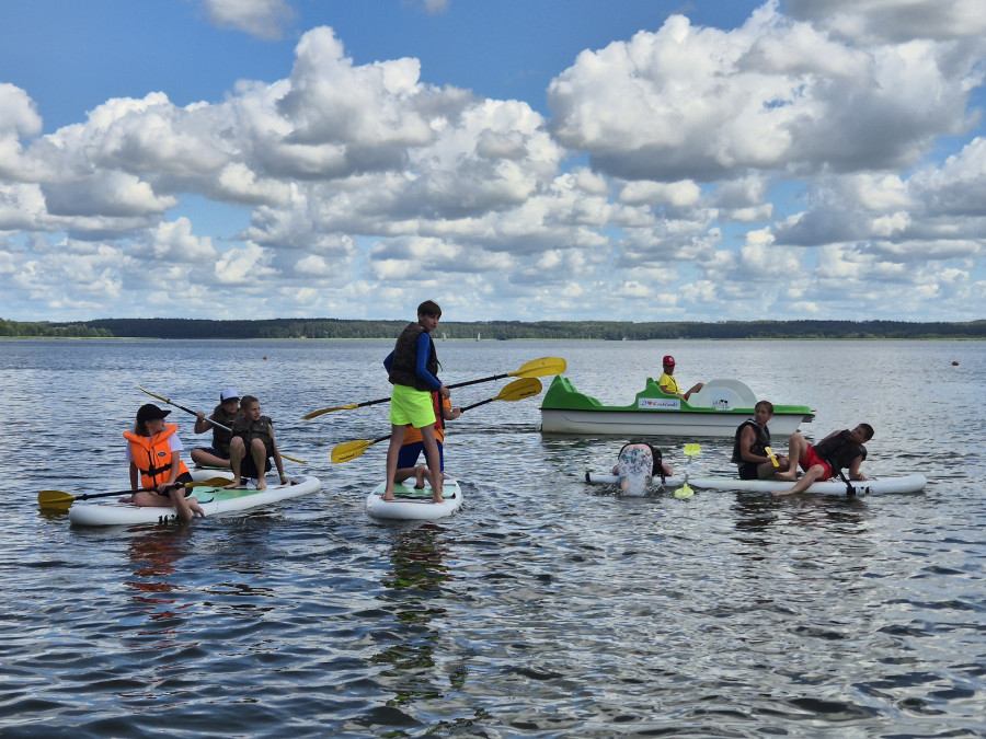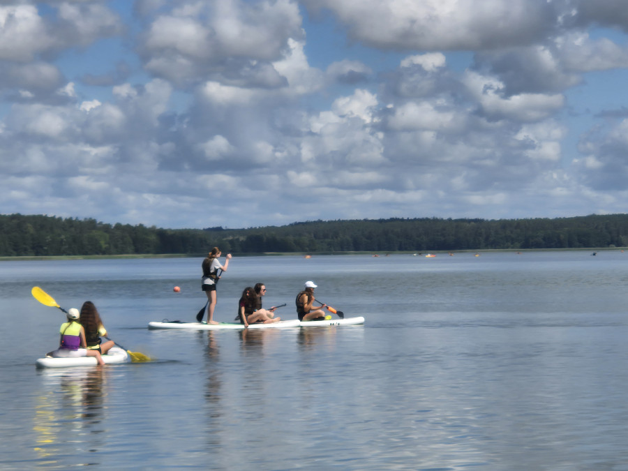 W tym czasie, gdy część z nas pływała na łódkach, pozostali kąpali się w wodzie, pływali na rowerach wodnych i deskach SUP, kajakach. W przerwach były gry i zabawy. Dzisiaj nauczyliśmy się gry w kręgle fińskie.