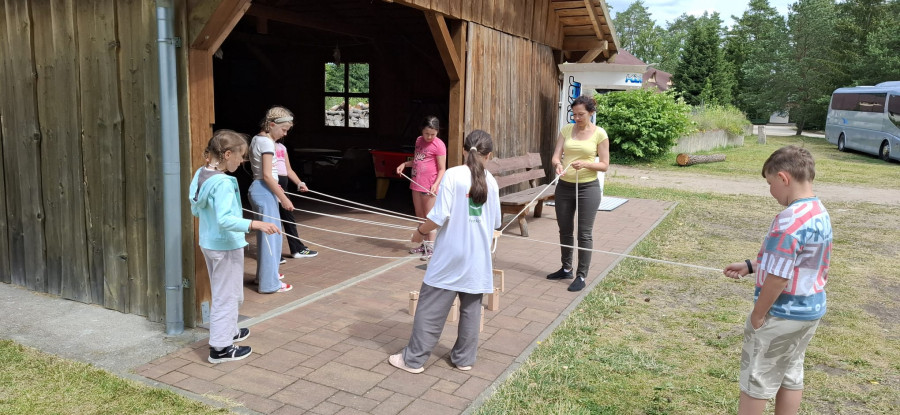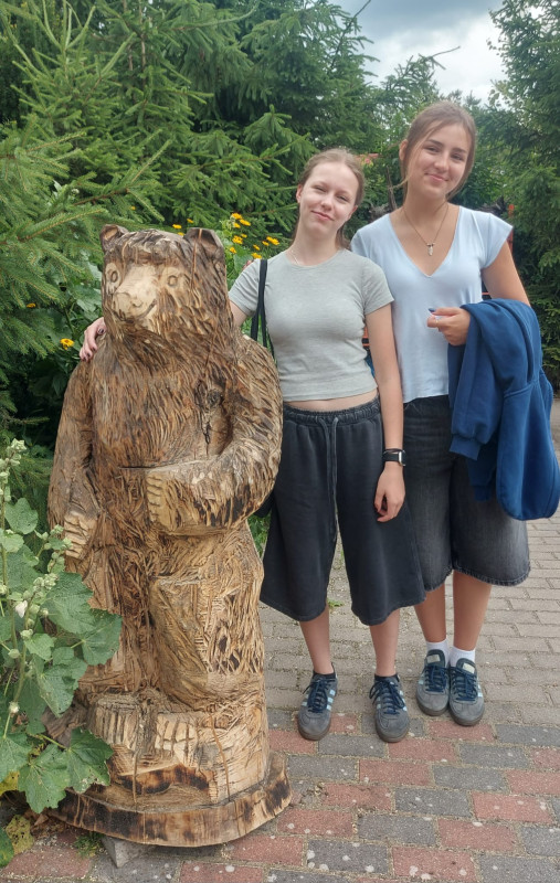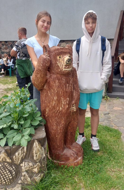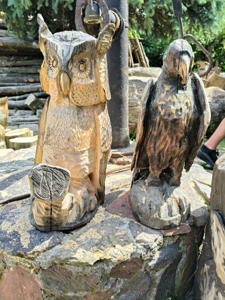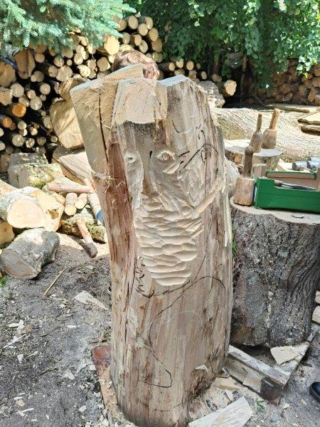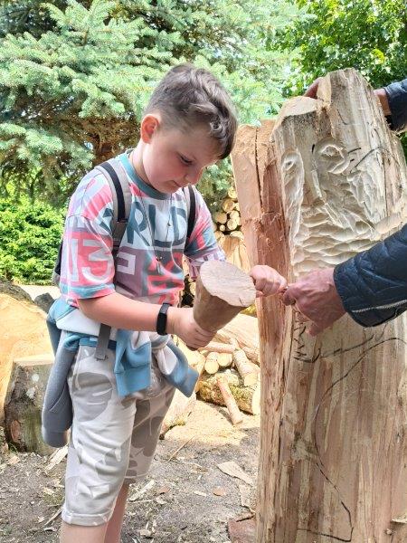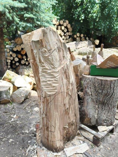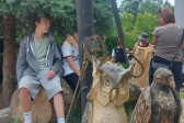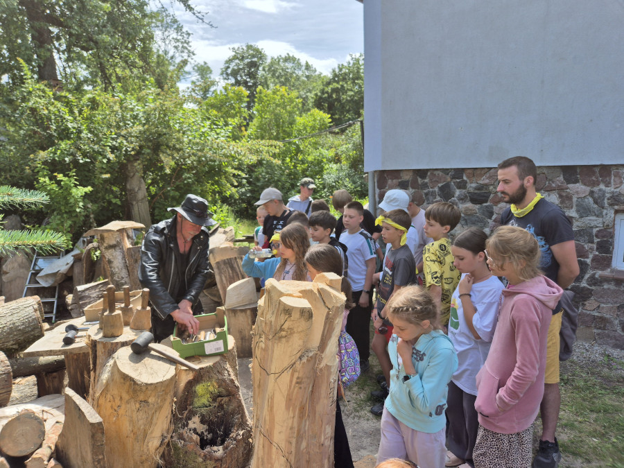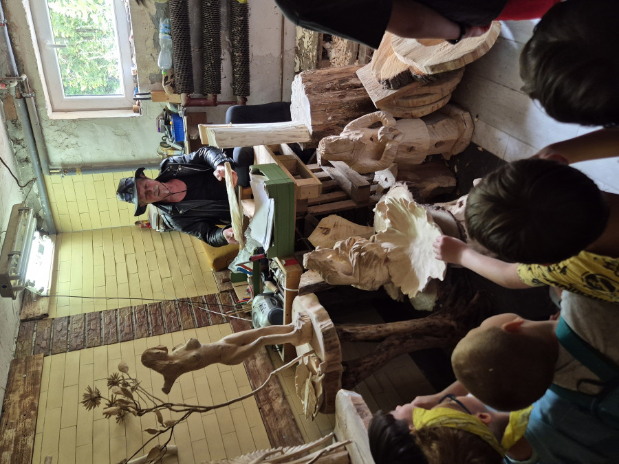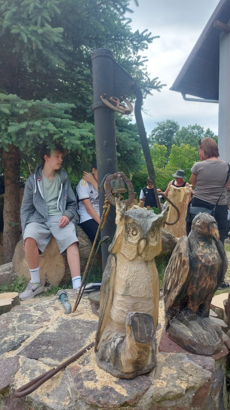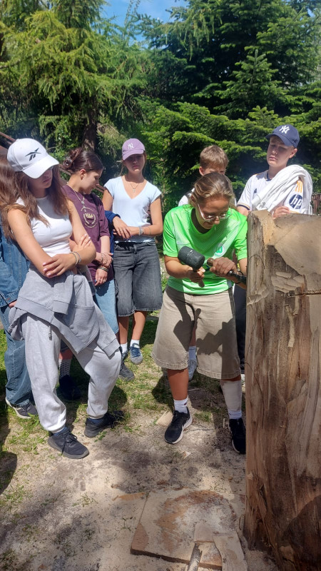 Podzieliliśmy się na 2 grupy: w czasie gdy starszych pan Józef wprowadzał tajniki rzeźbiarstwa, młodsi mieli gry na powietrzu w ośrodku ( pilka nozna, gry w kregle fińskie, wieża Ferbla...) i na zmianę.